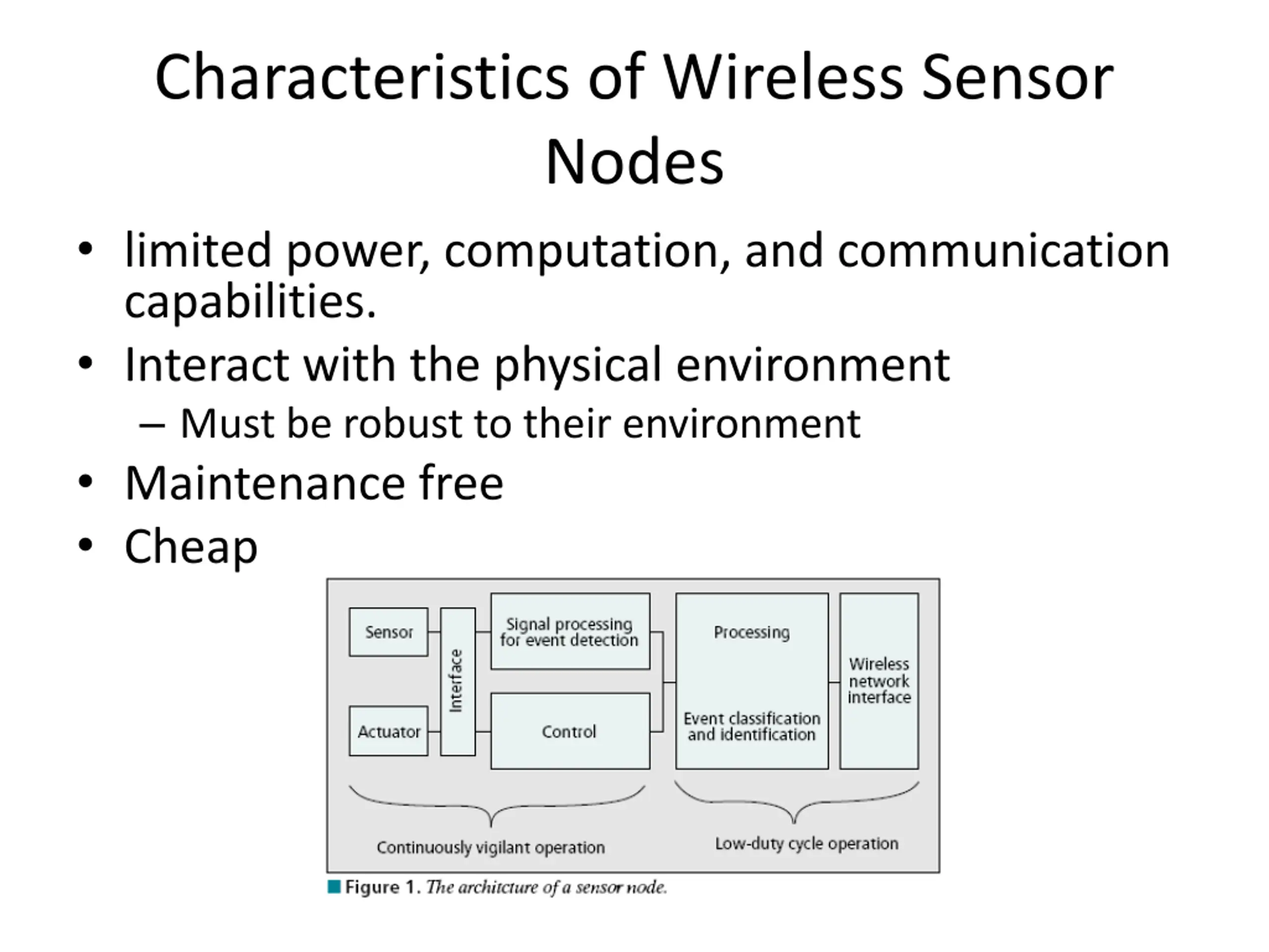 Characteristics of Wireless Sensor Nodes limited power, computation, and communication capabilities. Interact with the physical environment Must be robust to their environment Maintenance free Cheap