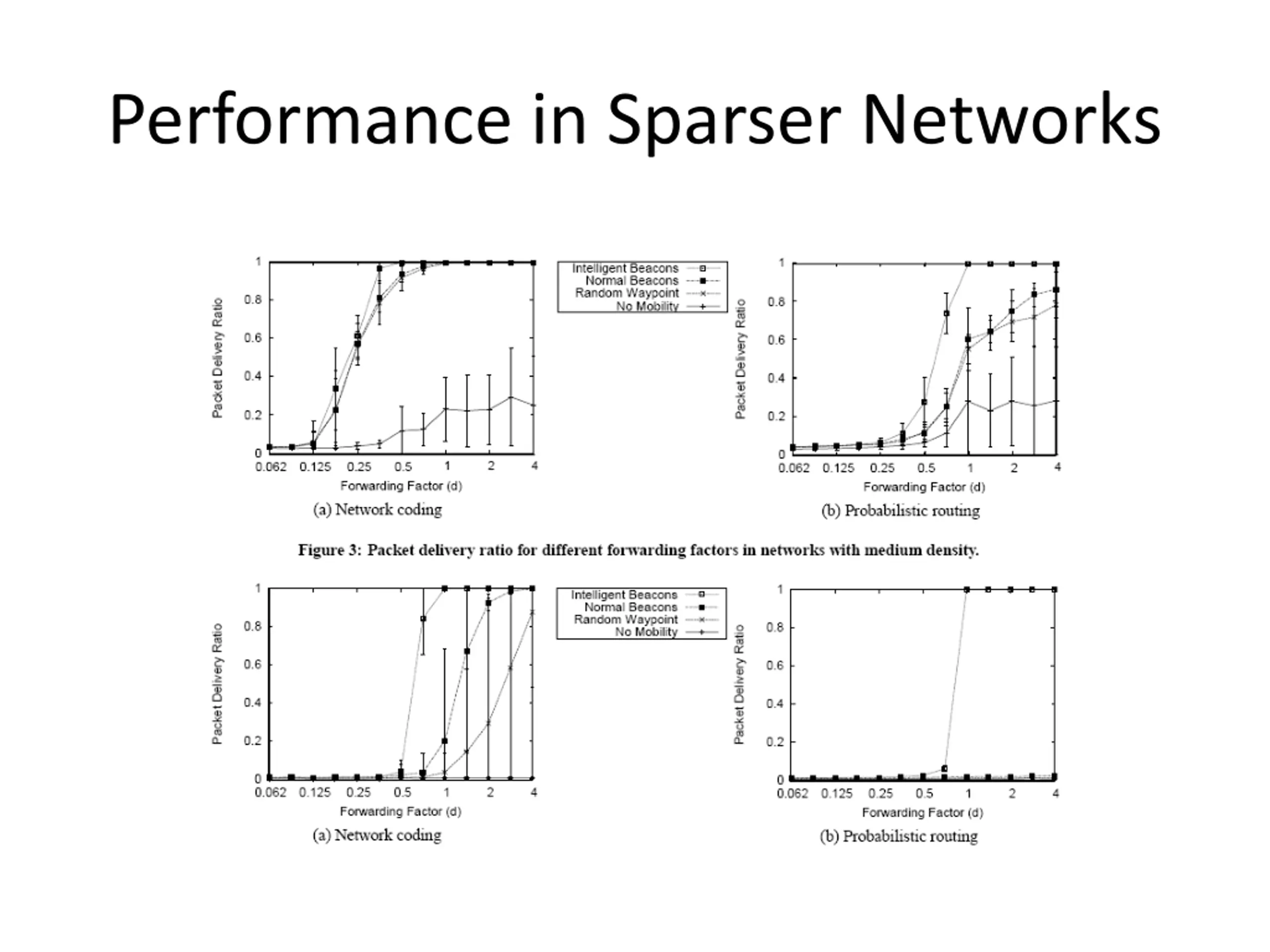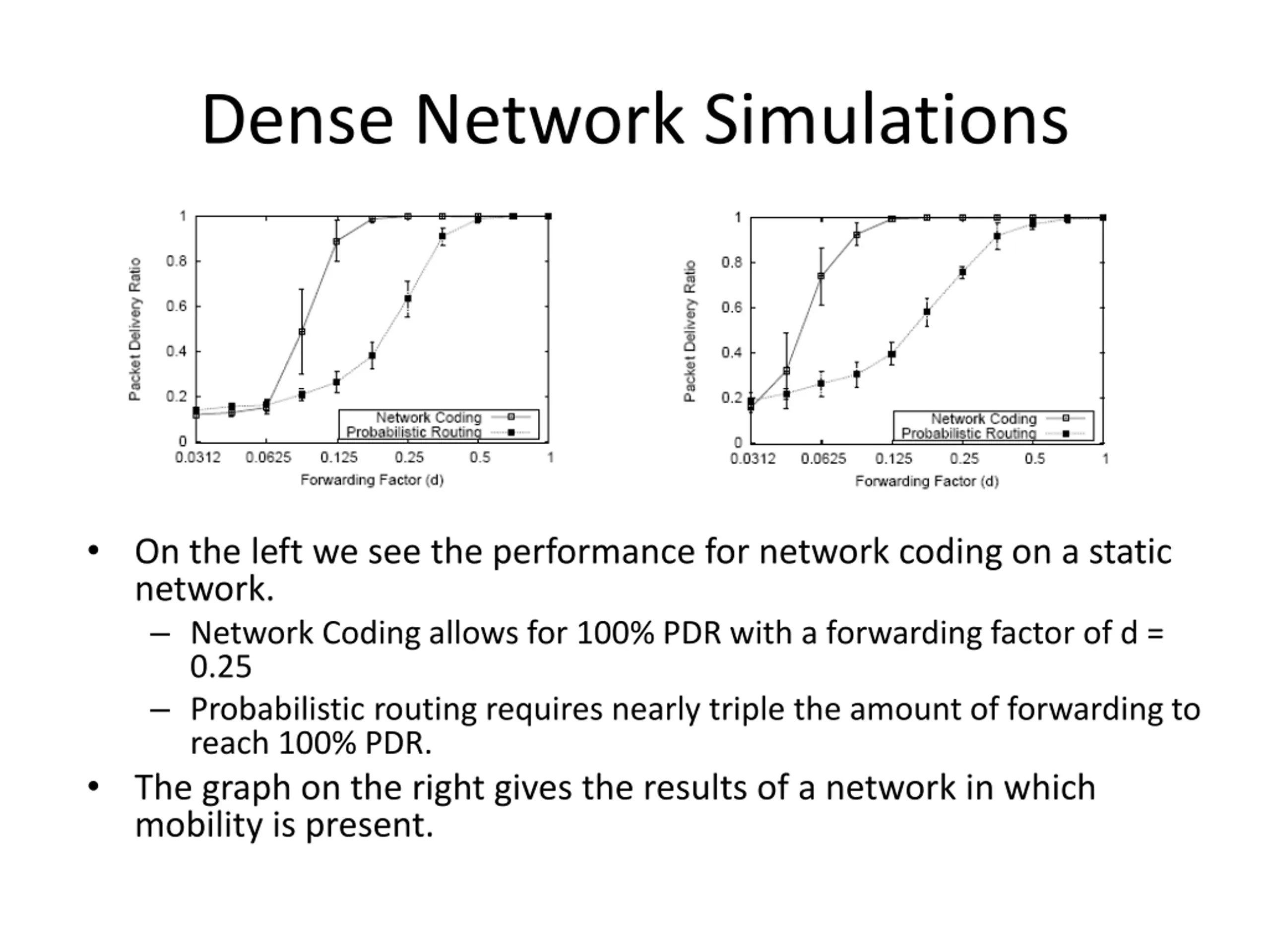 Dense Network Simulations On the left we see the performance for network coding on a static network. Network Coding allows for 100% PDR with a forwarding factor of d = 0.25 Probabilistic routing requires nearly triple the amount of forwarding to reach 100% PDR. The graph on the right gives the results of a network in which mobility is present.