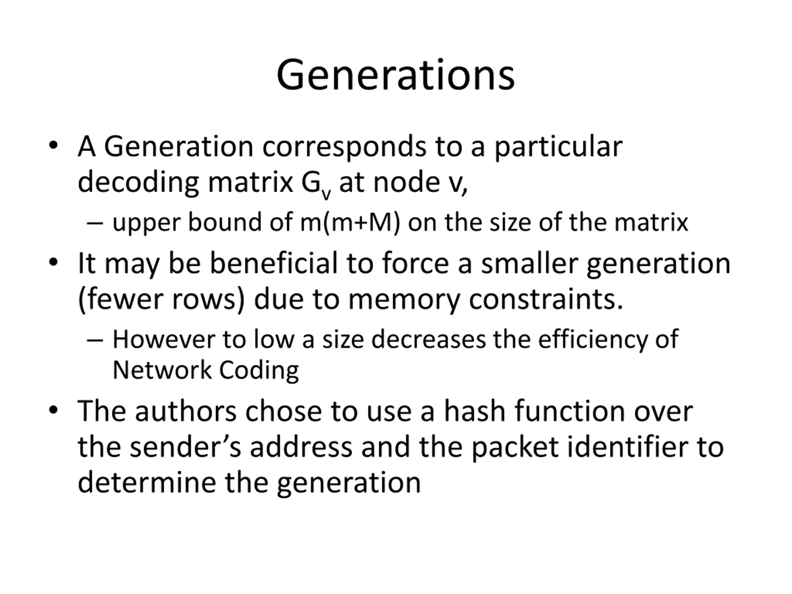 Generations A Generation corresponds to a particular decoding matrix Gv at node v, upper bound of m(m+M) on the size of the matrix It may be beneficial to force a smaller generation (fewer rows) due to memory constraints. However to low a size decreases the efficiency of Network Coding The authors chose to use a hash function over the sender s address and the packet identifier to determine the generation
