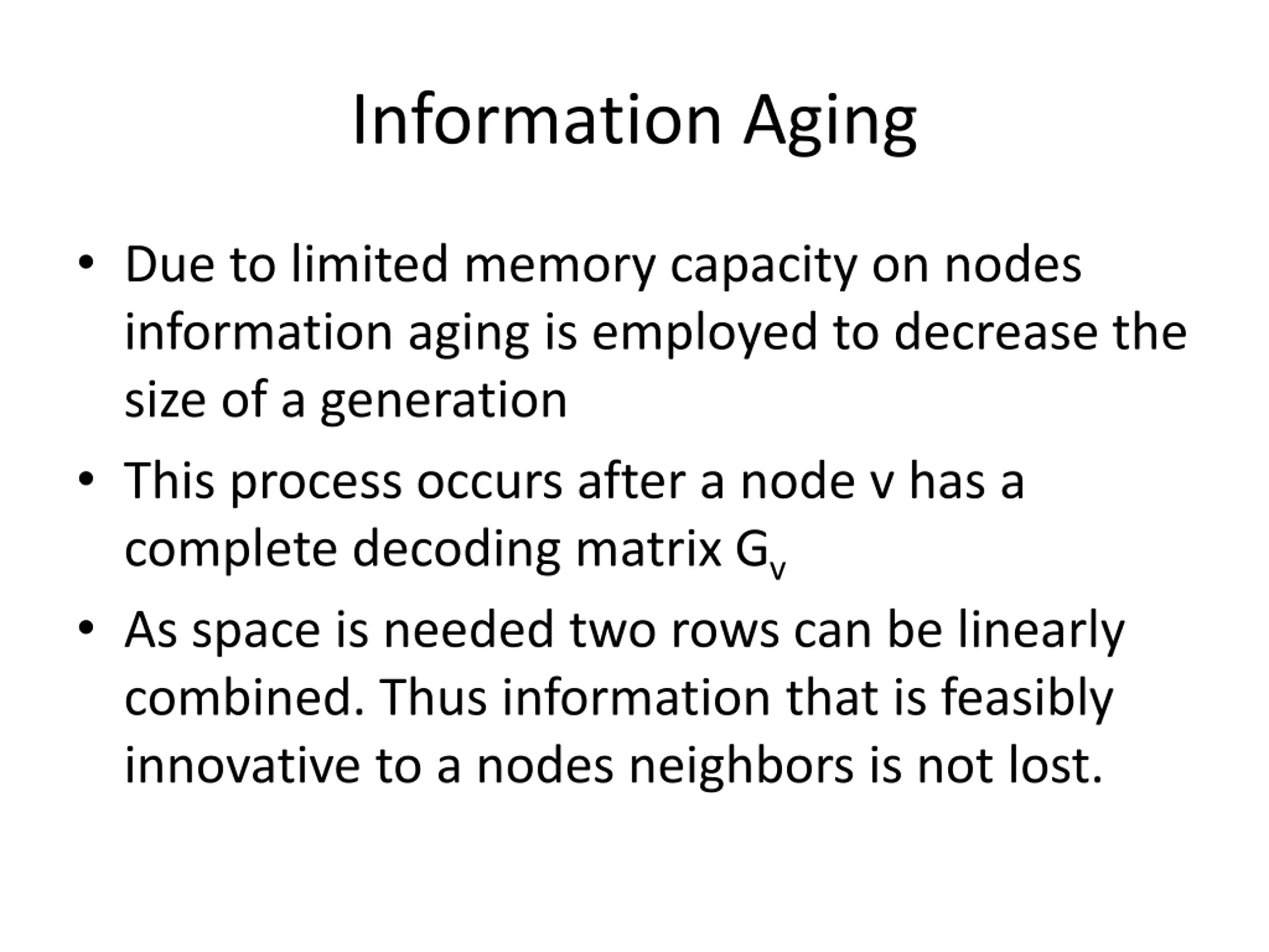 Information Aging Due to limited memory capacity on nodes information aging is employed to decrease the size of a generation This process occurs after a node v has a complete decoding matrix Gv As space is needed two rows can be linearly combined. Thus information that is feasibly innovative to a nodes neighbors is not lost.