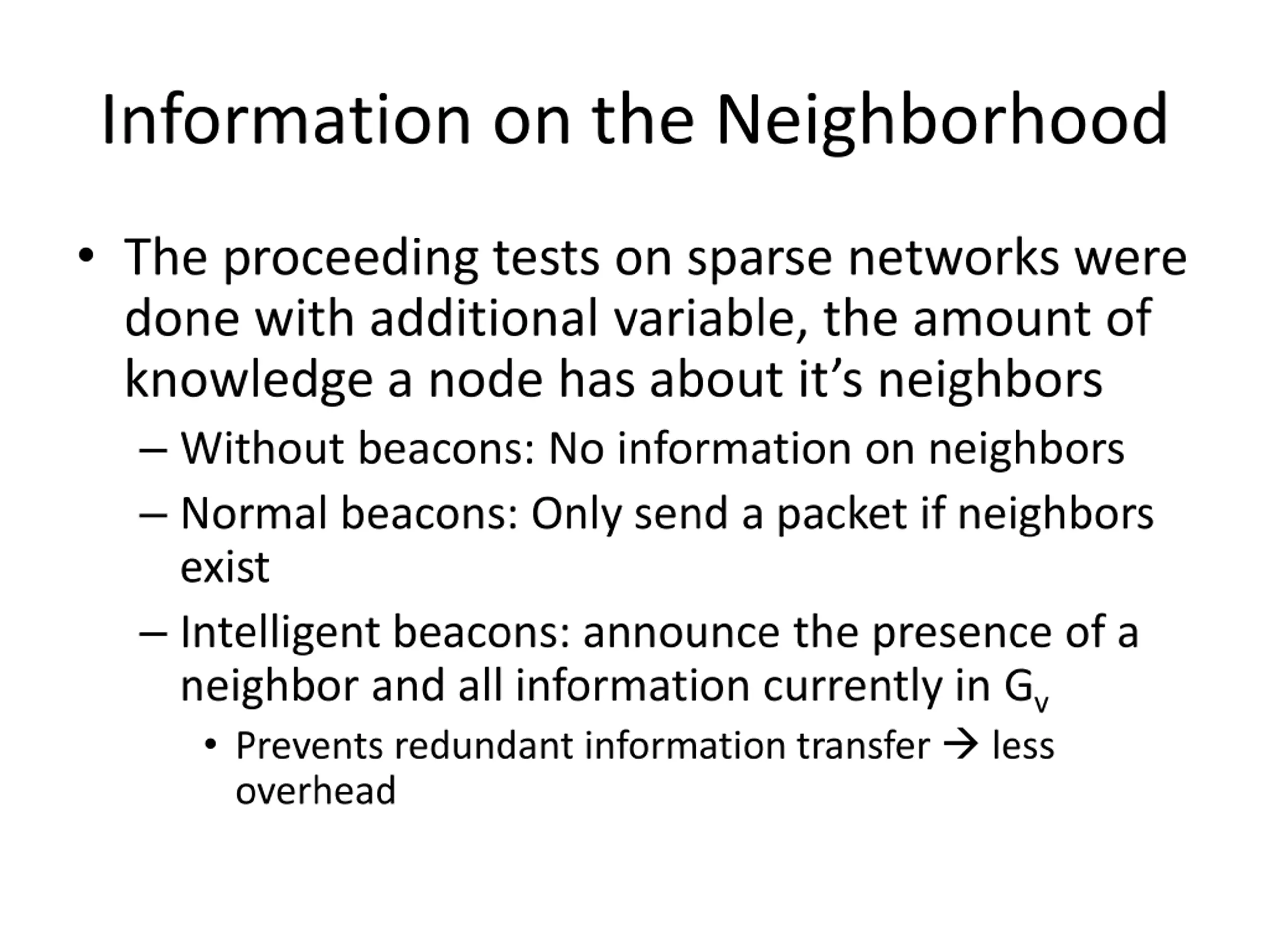 Information on the Neighborhood The proceeding tests on sparse networks were done with additional variable, the amount of knowledge a node has about it s neighbors Without beacons: No information on neighbors Normal beacons: Only send a packet if neighbors exist Intelligent beacons: announce the presence of a neighbor and all information currently in Gv Prevents redundant information transfer less overhead