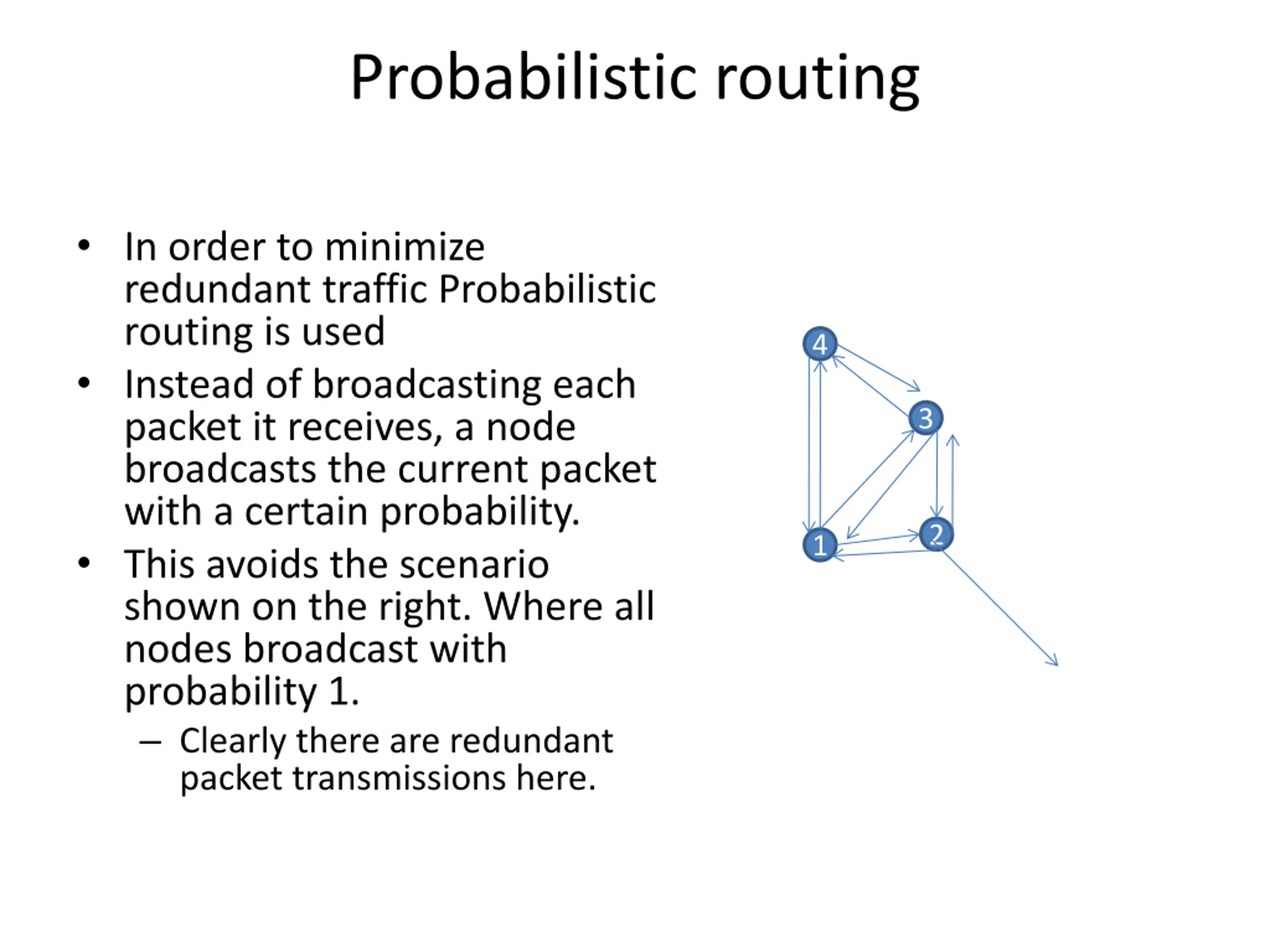 Probabilistic routing In order to minimize redundant traffic Probabilistic routing is used Instead of broadcasting each packet it receives, a node broadcasts the current packet with a certain probability. This avoids the scenario shown on the right. Where all nodes broadcast with probability 1. Clearly there are redundant packet transmissions here. 4 3 2 1