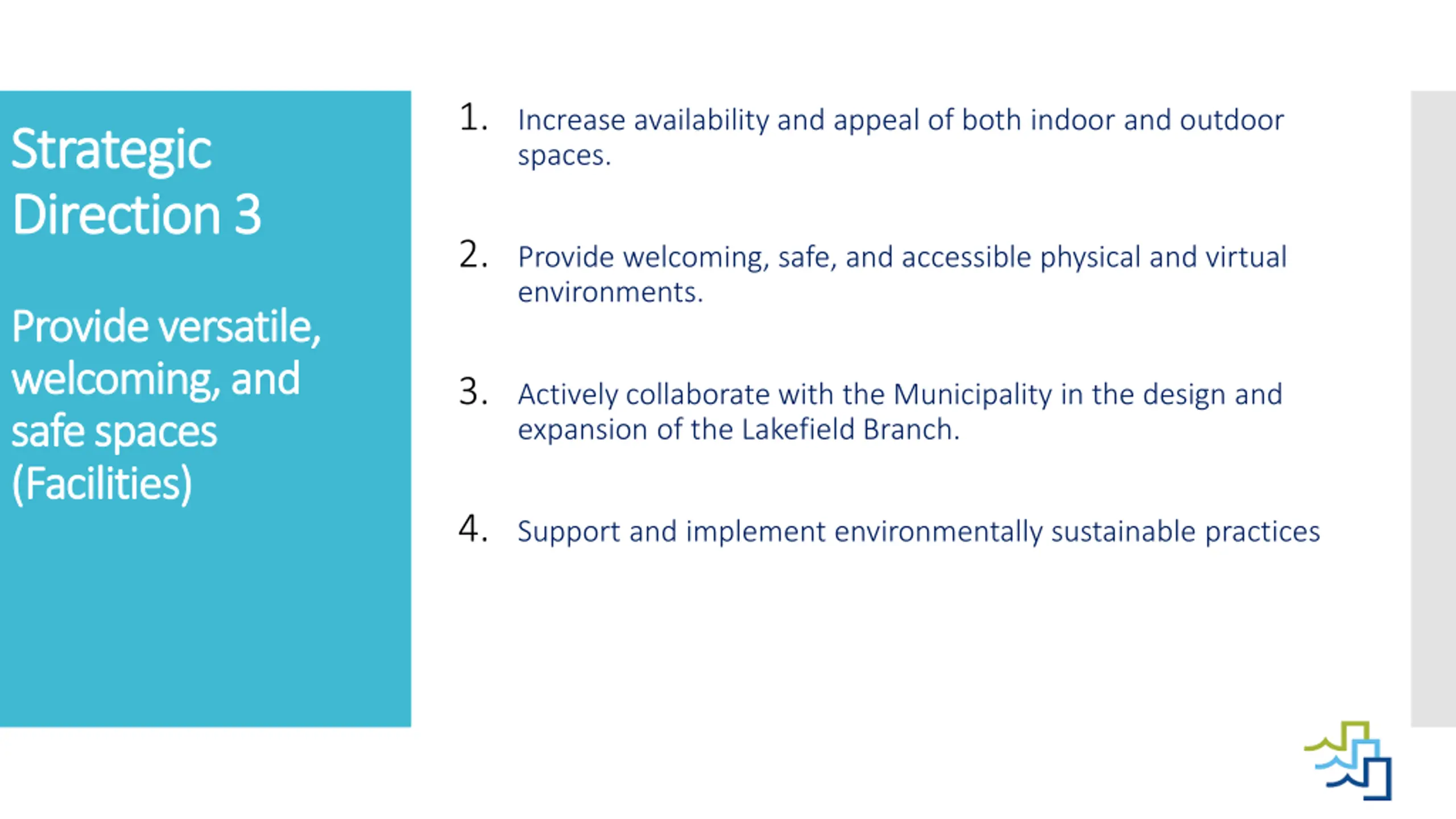 1. Increase availability and appeal of both indoor and outdoor spaces. Strategic Strategic Direction Direction 3 3 2. Provide welcoming, safe, and accessible physical and virtual environments. Provide versatile, Provide versatile, welcoming, and welcoming, and safe spaces safe spaces (Facilities) (Facilities) 3. Actively collaborate with the Municipality in the design and expansion of the Lakefield Branch. 4. Support and implement environmentally sustainable practices