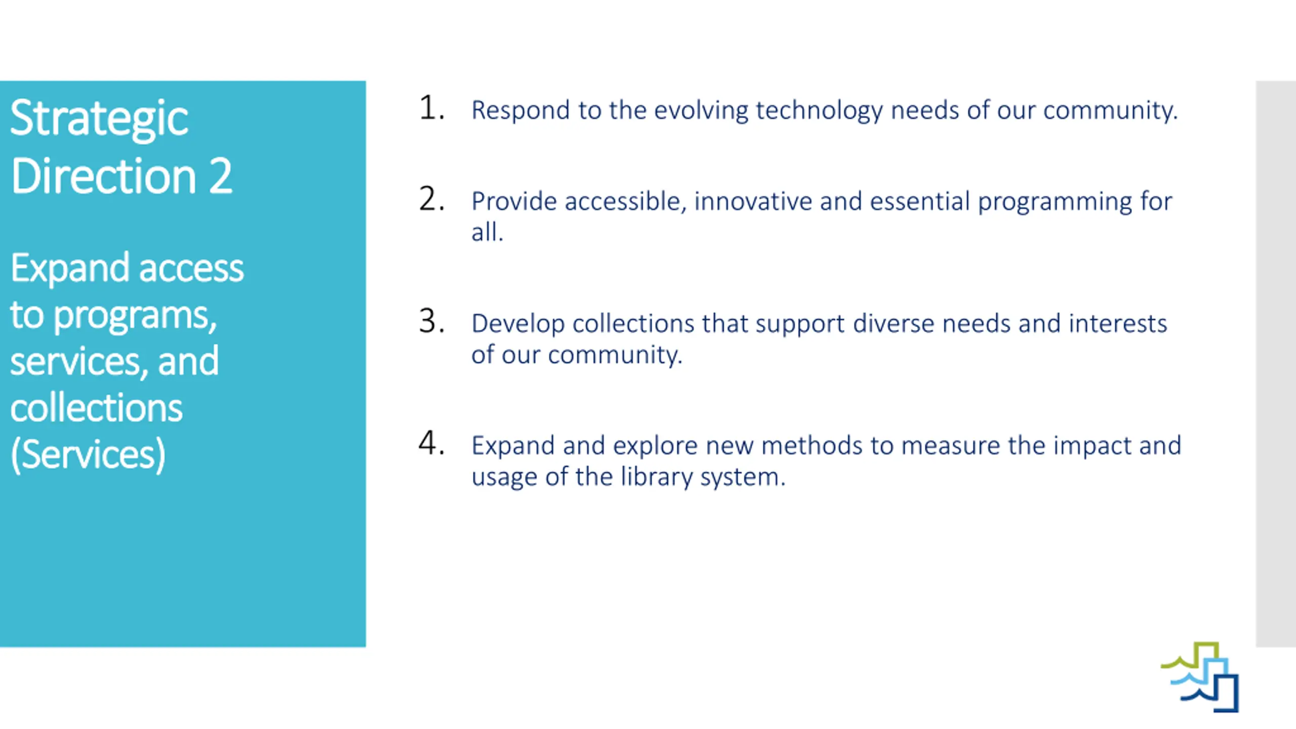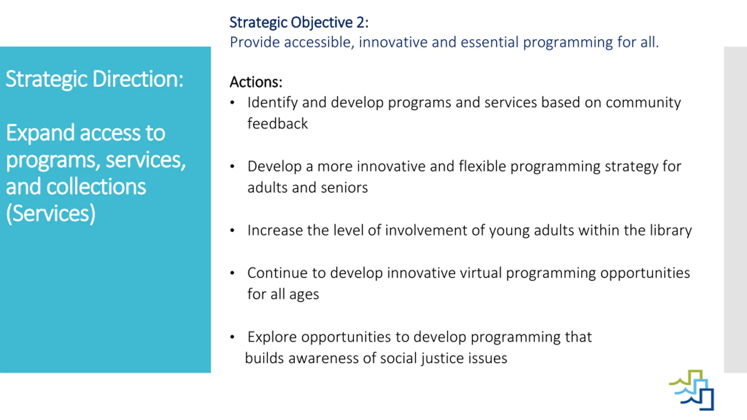 Strategic Objective 2: Strategic Objective 2: Provide accessible, innovative and essential programming for all. Strategic Direction: Strategic Direction: Actions: Actions: Identify and develop programs and services based on community feedback Expand Expand access to access to programs, services, programs, services, and collections and collections (Services) (Services) Develop a more innovative and flexible programming strategy for adults and seniors Increase the level of involvement of young adults within the library Continue to develop innovative virtual programming opportunities for all ages Explore opportunities to develop programming that builds awareness of social justice issues