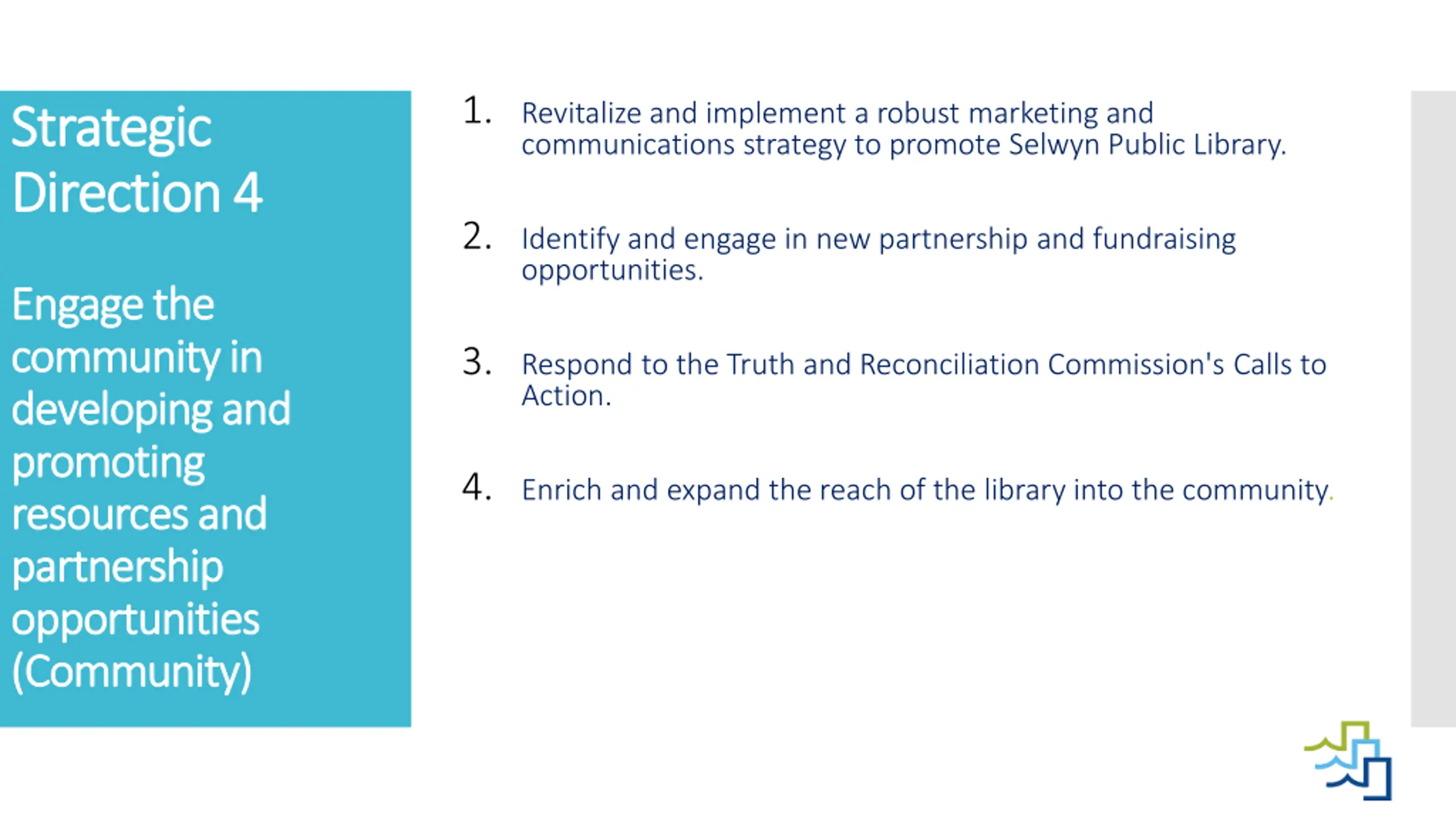 1. Revitalize and implement a robust marketing and communications strategy to promote Selwyn Public Library. Strategic Strategic Direction Direction 4 4 2. Identify and engage in new partnership and fundraising opportunities. Engage the Engage the community in community in developing and developing and promoting promoting resources and resources and partnership partnership opportunities opportunities (Community) (Community) 3. Respond to the Truth and Reconciliation Commission's Calls to Action. 4. Enrich and expand the reach of the library into the community.