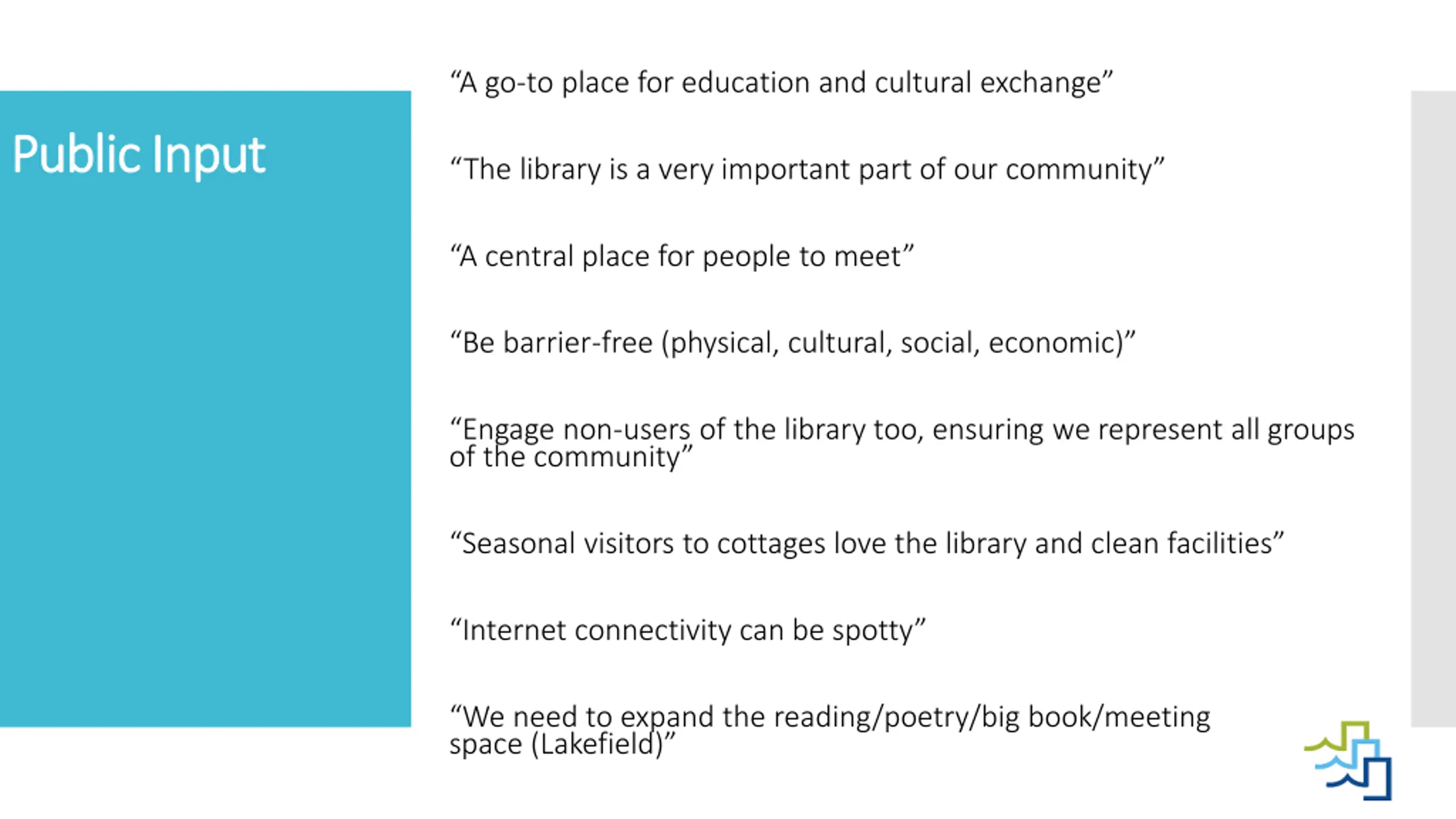 A go-to place for education and cultural exchange Public Input Public Input The library is a very important part of our community A central place for people to meet Be barrier-free (physical, cultural, social, economic) Engage non-users of the library too, ensuring we represent all groups of the community Seasonal visitors to cottages love the library and clean facilities Internet connectivity can be spotty We need to expand the reading/poetry/big book/meeting space (Lakefield)