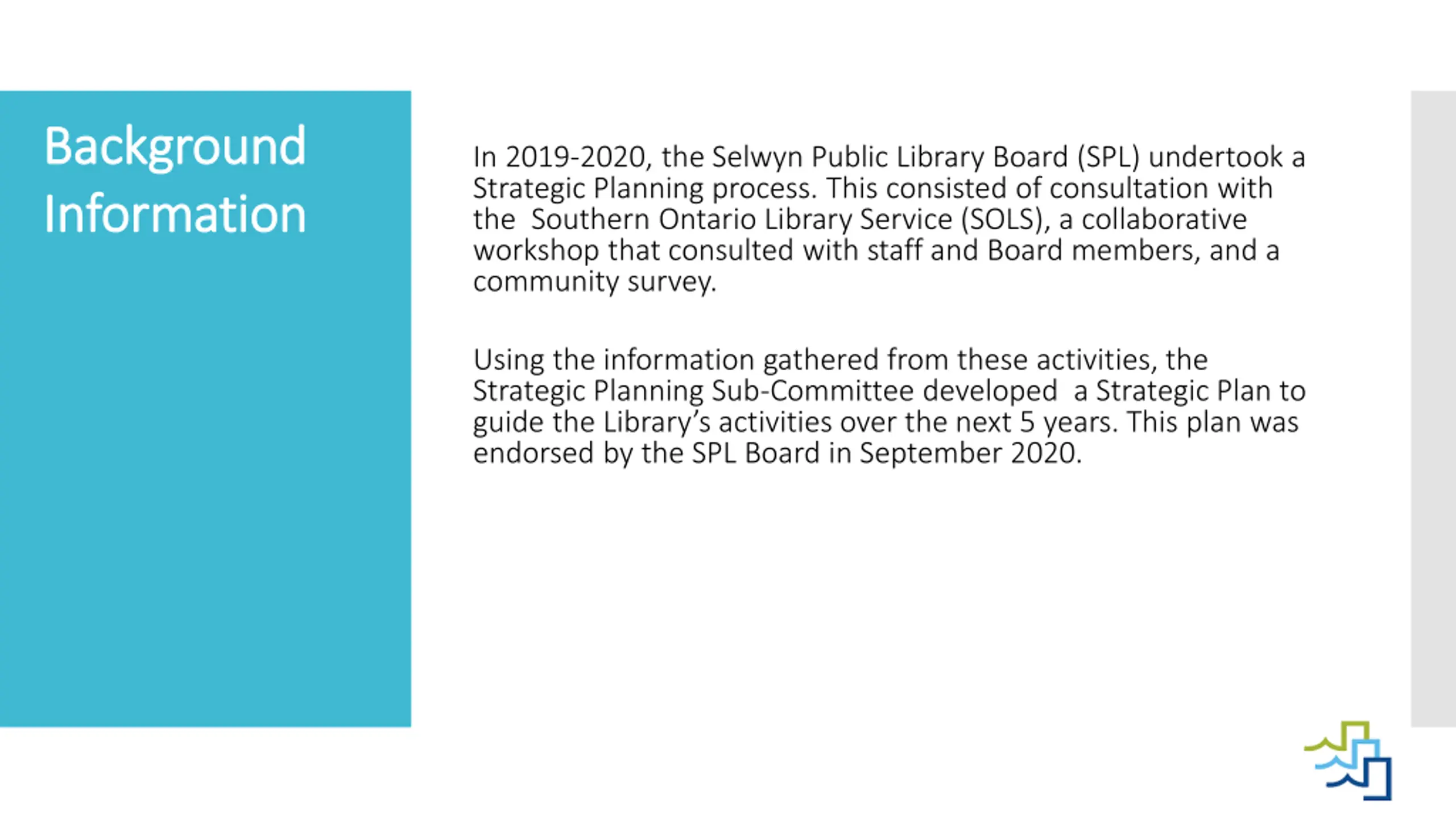 Background Background Information Information In 2019-2020, the Selwyn Public Library Board (SPL) undertook a Strategic Planning process. This consisted of consultation with the Southern Ontario Library Service (SOLS), a collaborative workshop that consulted with staff and Board members, and a community survey. Using the information gathered from these activities, the Strategic Planning Sub-Committee developed a Strategic Plan to guide the Library s activities over the next 5 years. This plan was endorsed by the SPL Board in September 2020.