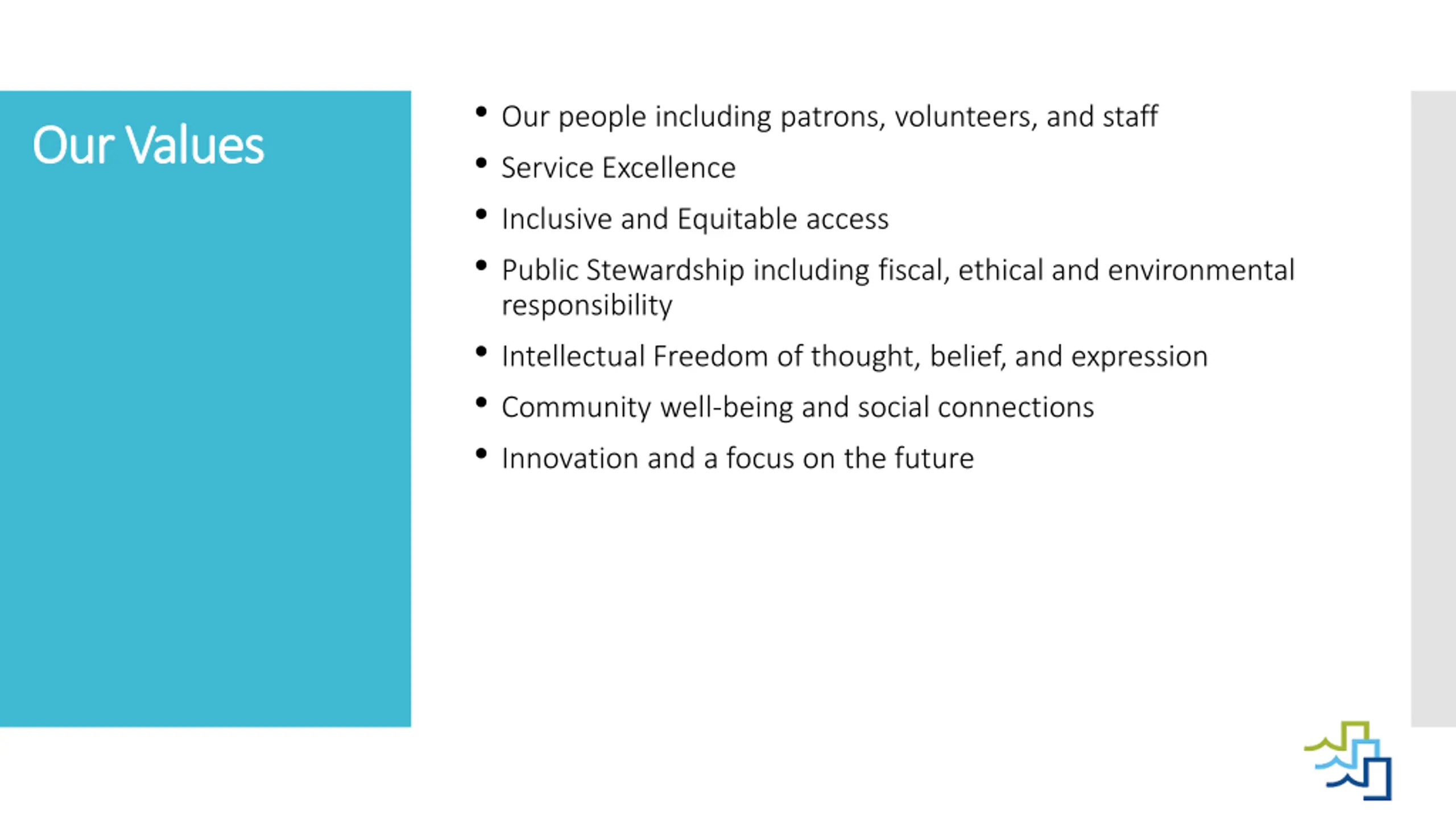 Our people including patrons, volunteers, and staff Service Excellence Inclusive and Equitable access Public Stewardship including fiscal, ethical and environmental responsibility Intellectual Freedom of thought, belief, and expression Community well-being and social connections Innovation and a focus on the future Our Values Our Values