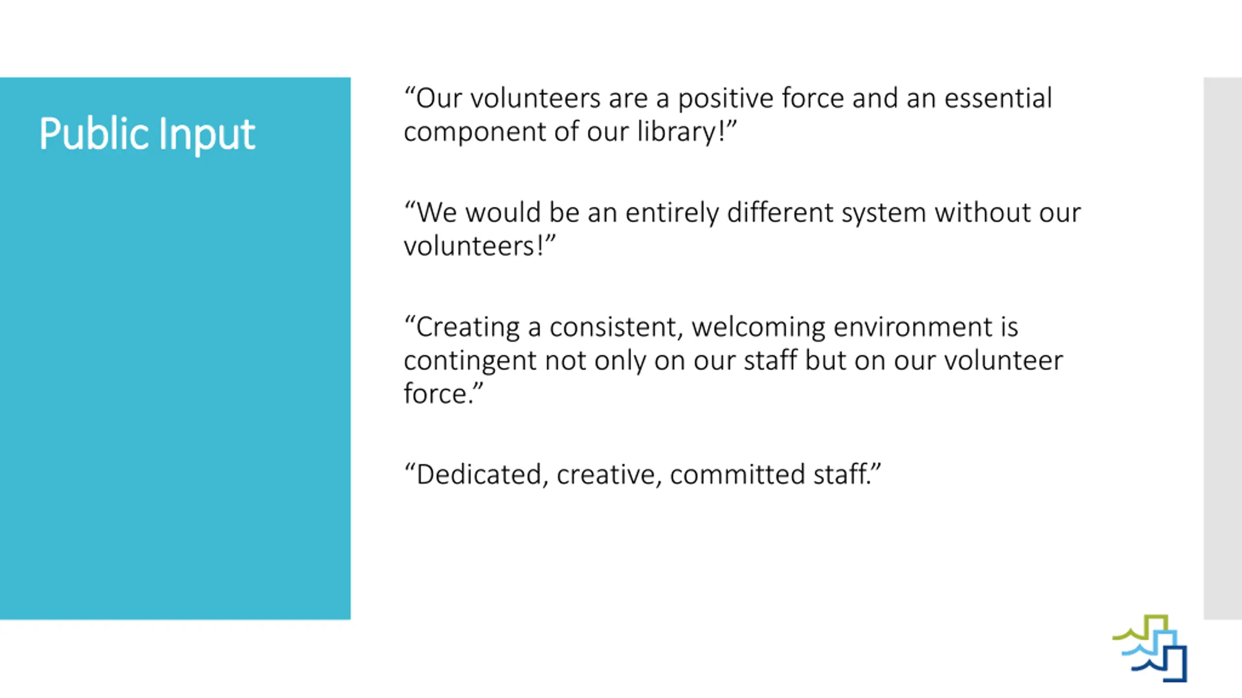Our volunteers are a positive force and an essential component of our library! Public Input Public Input We would be an entirely different system without our volunteers! Creating a consistent, welcoming environment is contingent not only on our staff but on our volunteer force. Dedicated, creative, committed staff.