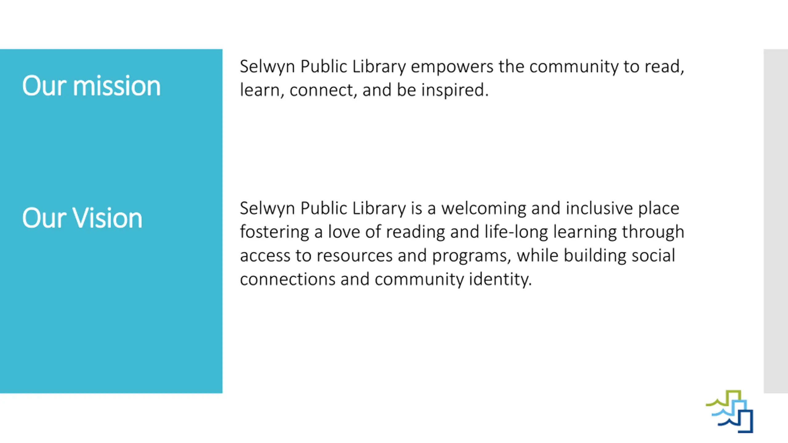 Selwyn Public Library empowers the community to read, learn, connect, and be inspired. Our Our mission mission Selwyn Public Library is a welcoming and inclusive place fostering a love of reading and life-long learning through access to resources and programs, while building social connections and community identity. Our Vision Our Vision