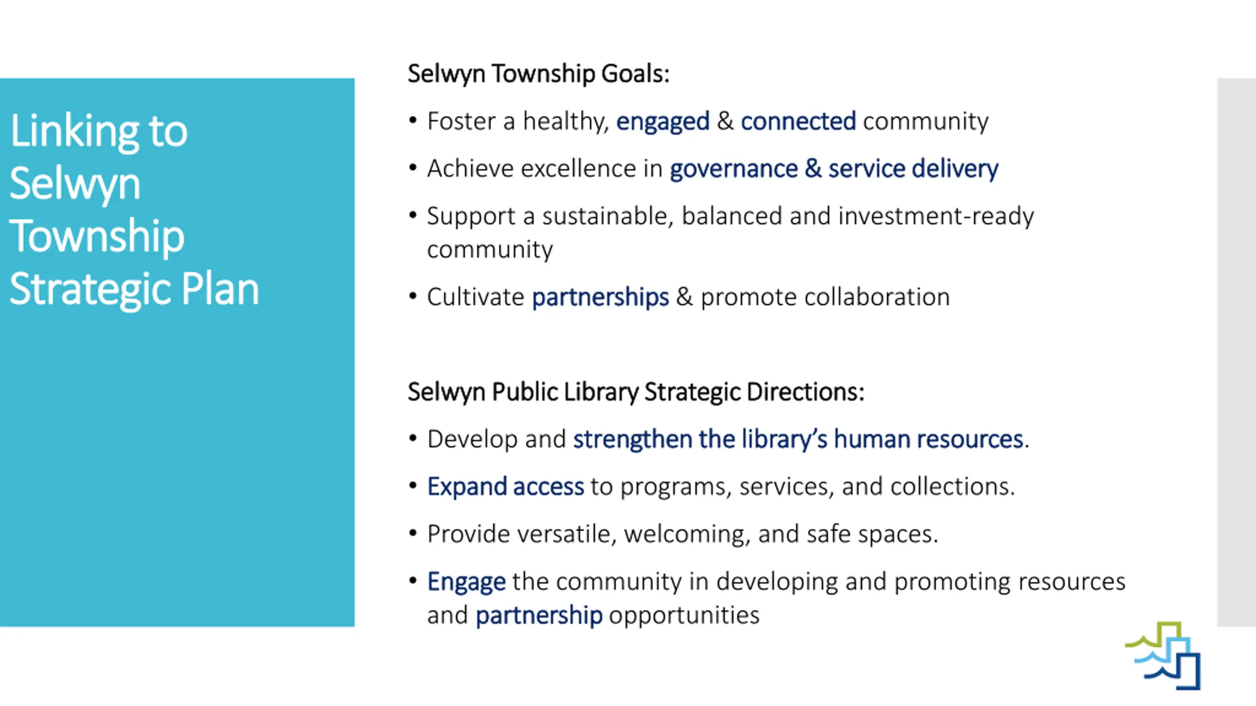 Selwyn Township Goals: Selwyn Township Goals: Foster a healthy, engaged engaged & connected connected community Linking to Linking to Selwyn Selwyn Township Township Strategic Plan Strategic Plan Achieve excellence in governance & service delivery governance & service delivery Support a sustainable, balanced and investment-ready community Cultivate partnerships partnerships & promote collaboration Selwyn Public Library Strategic Directions: Selwyn Public Library Strategic Directions: Develop and strengthen the library s human resources strengthen the library s human resources. Expand access Expand access to programs, services, and collections. Provide versatile, welcoming, and safe spaces. Engage Engage the community in developing and promoting resources and partnership partnership opportunities