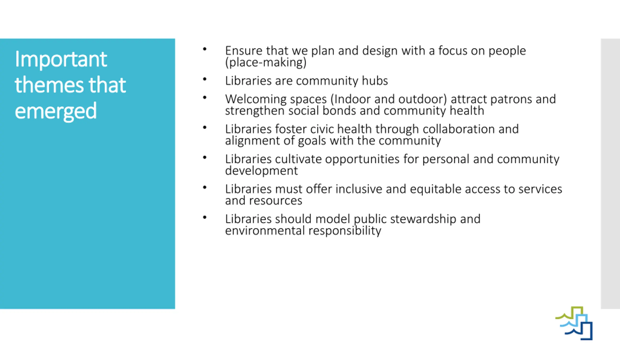 Ensure that we plan and design with a focus on people (place-making) Libraries are community hubs Welcoming spaces (Indoor and outdoor) attract patrons and strengthen social bonds and community health Libraries foster civic health through collaboration and alignment of goals with the community Libraries cultivate opportunities for personal and community development Libraries must offer inclusive and equitable access to services and resources Libraries should model public stewardship and environmental responsibility Important Important themes that themes that emerged emerged