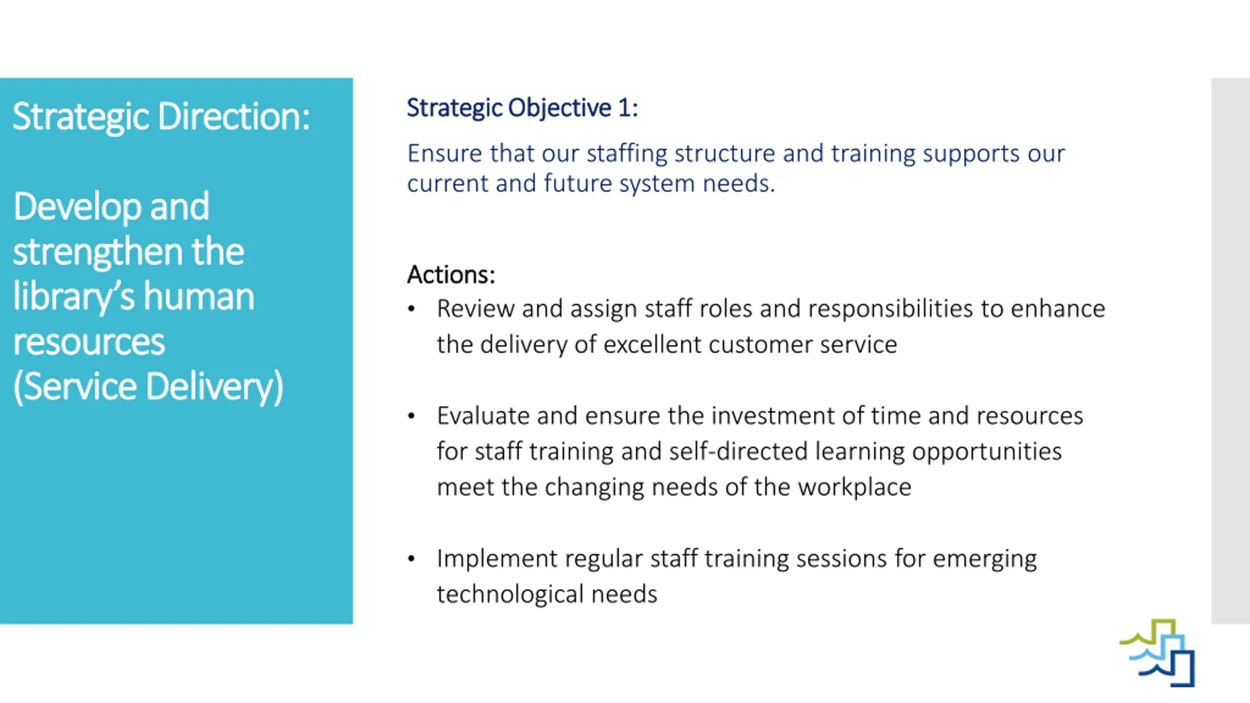Strategic Objective 1: Strategic Objective 1: Strategic Direction Strategic Direction: : Ensure that our staffing structure and training supports our current and future system needs. Develop and Develop and strengthen the strengthen the library s human library s human resources resources (Service Delivery) (Service Delivery) Actions: Actions: Review and assign staff roles and responsibilities to enhance the delivery of excellent customer service Evaluate and ensure the investment of time and resources for staff training and self-directed learning opportunities meet the changing needs of the workplace Implement regular staff training sessions for emerging technological needs
