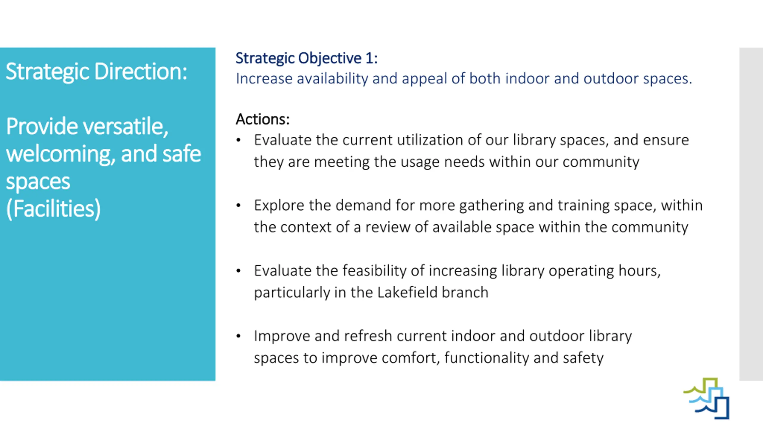 Strategic Objective 1: Strategic Objective 1: Increase availability and appeal of both indoor and outdoor spaces. Strategic Direction: Strategic Direction: Actions: Actions: Evaluate the current utilization of our library spaces, and ensure they are meeting the usage needs within our community Provide Provide versatile, versatile, welcoming, and safe welcoming, and safe spaces spaces (Facilities) (Facilities) Explore the demand for more gathering and training space, within the context of a review of available space within the community Evaluate the feasibility of increasing library operating hours, particularly in the Lakefield branch Improve and refresh current indoor and outdoor library spaces to improve comfort, functionality and safety