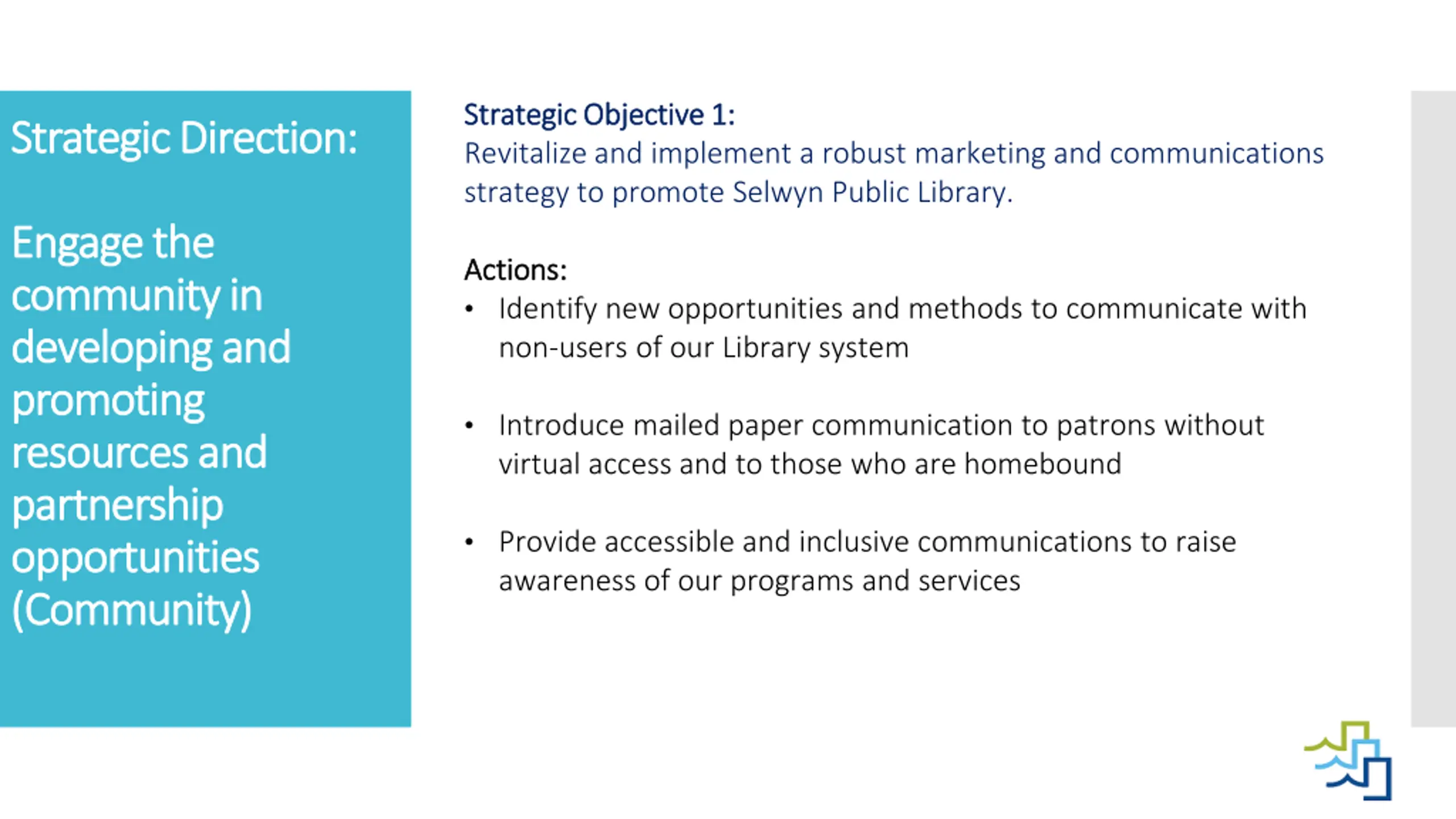 Strategic Objective 1: Strategic Objective 1: Revitalize and implement a robust marketing and communications strategy to promote Selwyn Public Library. Strategic Direction: Strategic Direction: Engage Engage the community in community in developing and developing and promoting promoting resources and resources and partnership partnership opportunities opportunities (Community) (Community) the Actions: Actions: Identify new opportunities and methods to communicate with non-users of our Library system Introduce mailed paper communication to patrons without virtual access and to those who are homebound Provide accessible and inclusive communications to raise awareness of our programs and services