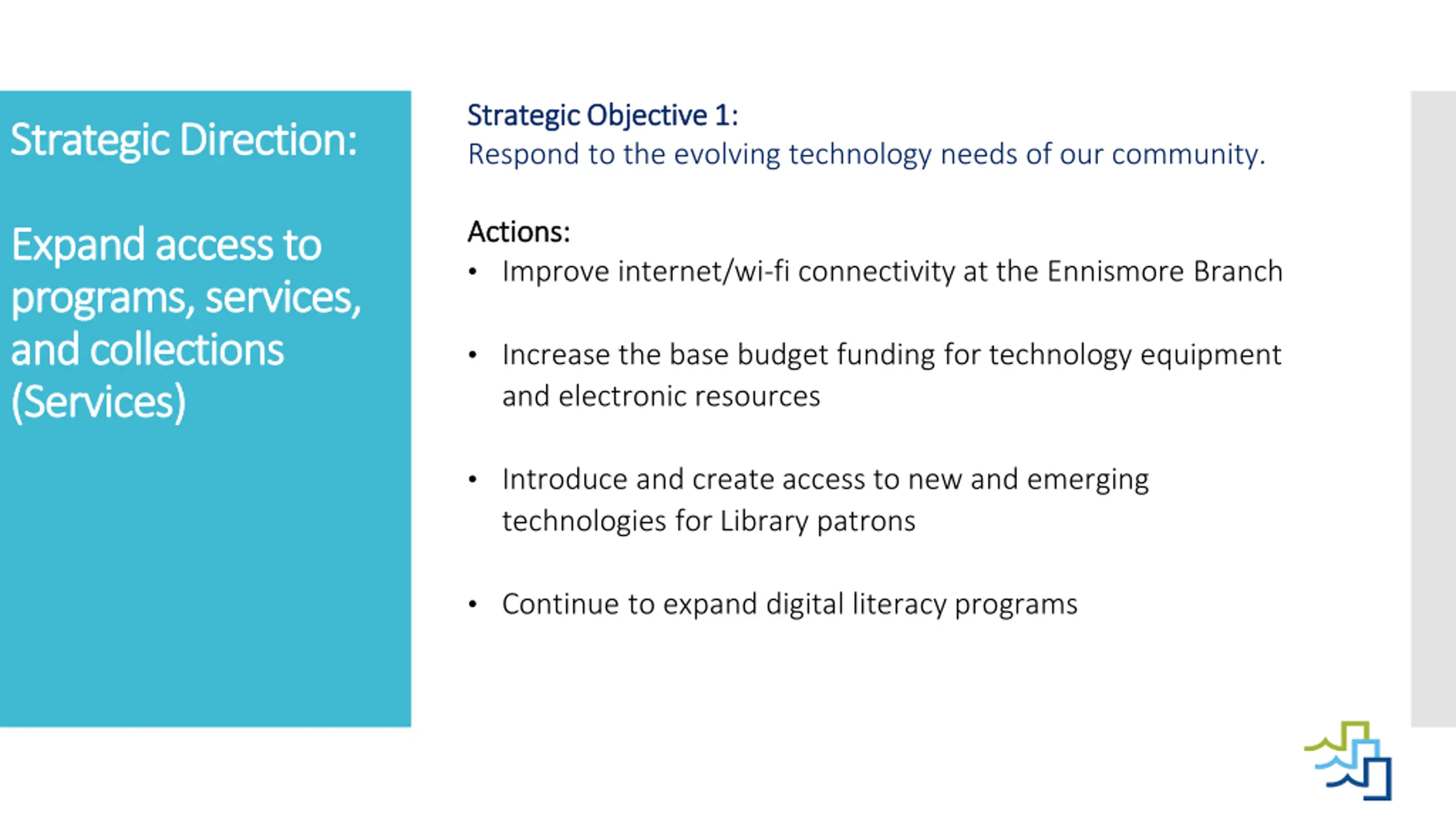 Strategic Objective 1: Strategic Objective 1: Respond to the evolving technology needs of our community. Strategic Direction: Strategic Direction: Actions: Actions: Improve internet/wi-fi connectivity at the Ennismore Branch Expand Expand access to access to programs, services, programs, services, and collections and collections (Services) (Services) Increase the base budget funding for technology equipment and electronic resources Introduce and create access to new and emerging technologies for Library patrons Continue to expand digital literacy programs