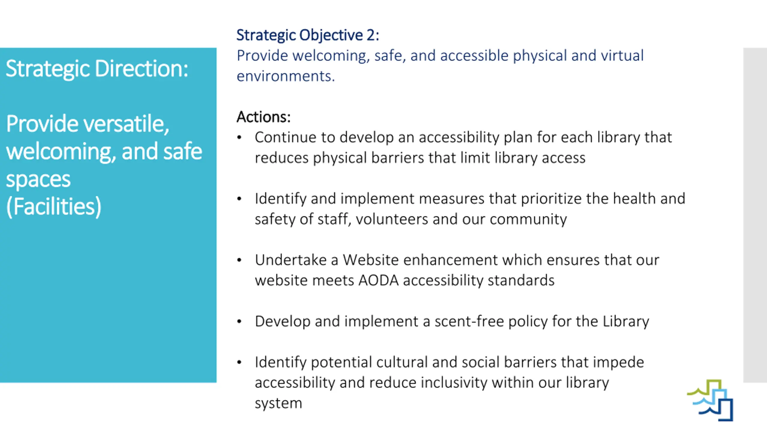 Strategic Objective 2: Strategic Objective 2: Provide welcoming, safe, and accessible physical and virtual environments. Strategic Direction: Strategic Direction: Actions: Actions: Continue to develop an accessibility plan for each library that reduces physical barriers that limit library access Identify and implement measures that prioritize the health and safety of staff, volunteers and our community Provide Provide versatile, versatile, welcoming, and safe welcoming, and safe spaces spaces (Facilities) (Facilities) Undertake a Website enhancement which ensures that our website meets AODA accessibility standards Develop and implement a scent-free policy for the Library Identify potential cultural and social barriers that impede accessibility and reduce inclusivity within our library system