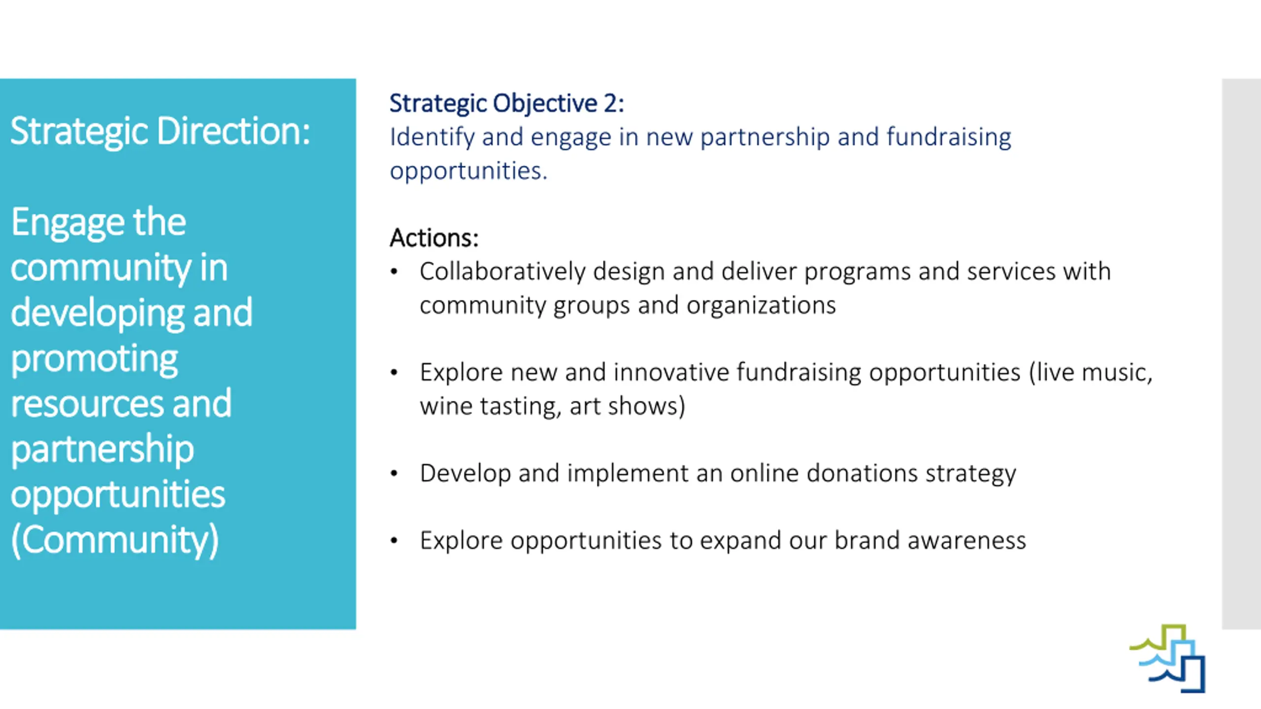 Strategic Objective 2: Strategic Objective 2: Identify and engage in new partnership and fundraising opportunities. Strategic Direction: Strategic Direction: Engage Engage the community in community in developing and developing and promoting promoting resources and resources and partnership partnership opportunities opportunities (Community) (Community) the Actions: Actions: Collaboratively design and deliver programs and services with community groups and organizations Explore new and innovative fundraising opportunities (live music, wine tasting, art shows) Develop and implement an online donations strategy Explore opportunities to expand our brand awareness