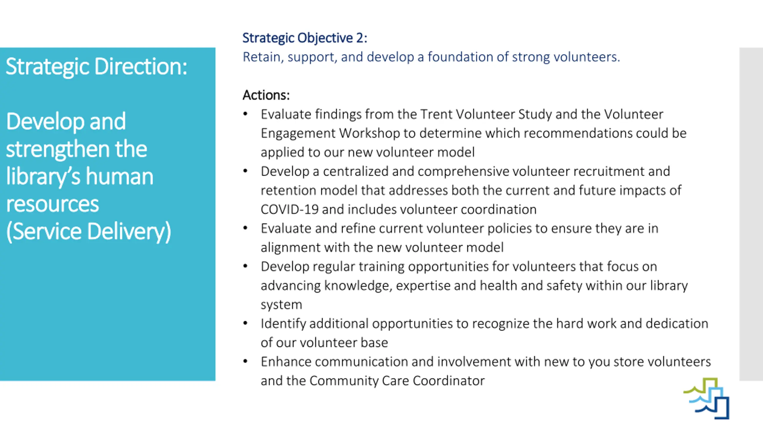 Strategic Objective 2: Strategic Objective 2: Retain, support, and develop a foundation of strong volunteers. Strategic Direction: Strategic Direction: Actions: Actions: Evaluate findings from the Trent Volunteer Study and the Volunteer Engagement Workshop to determine which recommendations could be applied to our new volunteer model Develop a centralized and comprehensive volunteer recruitment and retention model that addresses both the current and future impacts of COVID-19 and includes volunteer coordination Evaluate and refine current volunteer policies to ensure they are in alignment with the new volunteer model Develop regular training opportunities for volunteers that focus on advancing knowledge, expertise and health and safety within our library system Identify additional opportunities to recognize the hard work and dedication of our volunteer base Enhance communication and involvement with new to you store volunteers and the Community Care Coordinator Develop Develop and strengthen the strengthen the library s human library s human resources resources (Service Delivery) (Service Delivery) and