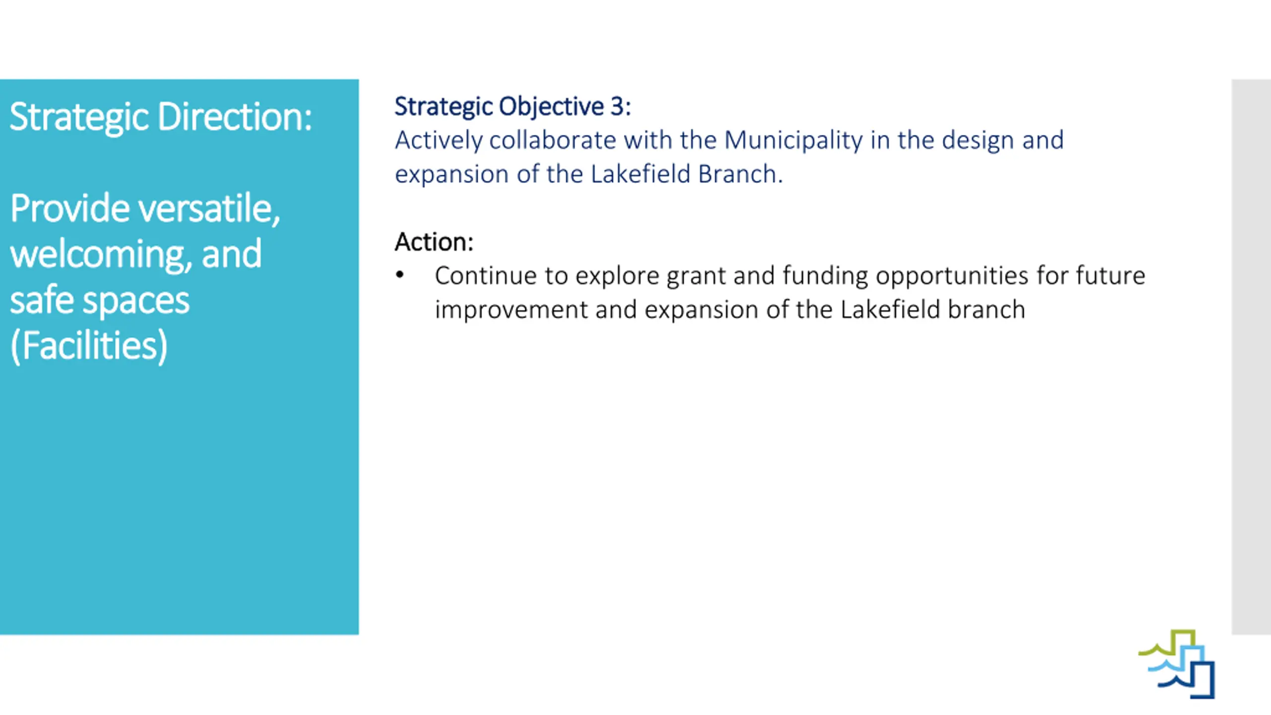 Strategic Objective 3: Strategic Objective 3: Actively collaborate with the Municipality in the design and expansion of the Lakefield Branch. Strategic Direction: Strategic Direction: Provide Provide versatile, versatile, welcoming, and welcoming, and safe spaces safe spaces (Facilities) (Facilities) Action: Action: Continue to explore grant and funding opportunities for future improvement and expansion of the Lakefield branch