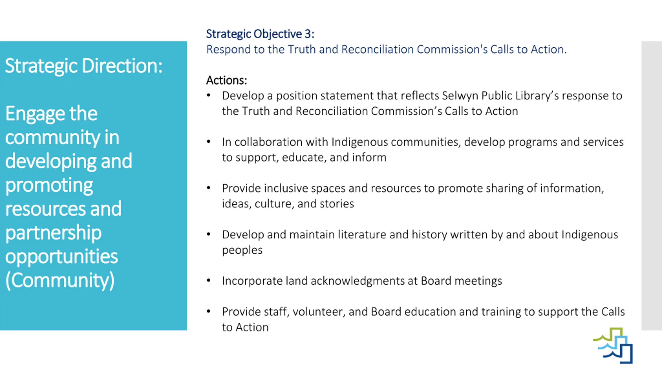 Strategic Objective 3: Strategic Objective 3: Respond to the Truth and Reconciliation Commission's Calls to Action. Strategic Direction: Strategic Direction: Actions: Actions: Develop a position statement that reflects Selwyn Public Library s response to the Truth and Reconciliation Commission s Calls to Action Engage Engage the community in community in developing and developing and promoting promoting resources and resources and partnership partnership opportunities opportunities (Community) (Community) the In collaboration with Indigenous communities, develop programs and services to support, educate, and inform Provide inclusive spaces and resources to promote sharing of information, ideas, culture, and stories Develop and maintain literature and history written by and about Indigenous peoples Incorporate land acknowledgments at Board meetings Provide staff, volunteer, and Board education and training to support the Calls to Action