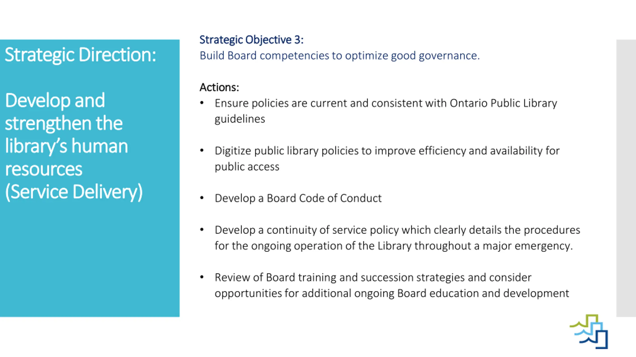 Strategic Objective 3: Strategic Objective 3: Build Board competencies to optimize good governance. Strategic Direction Strategic Direction: : Actions: Actions: Ensure policies are current and consistent with Ontario Public Library guidelines Develop and Develop and strengthen the strengthen the library s human library s human resources resources (Service Delivery) (Service Delivery) Digitize public library policies to improve efficiency and availability for public access Develop a Board Code of Conduct Develop a continuity of service policy which clearly details the procedures for the ongoing operation of the Library throughout a major emergency. Review of Board training and succession strategies and consider opportunities for additional ongoing Board education and development