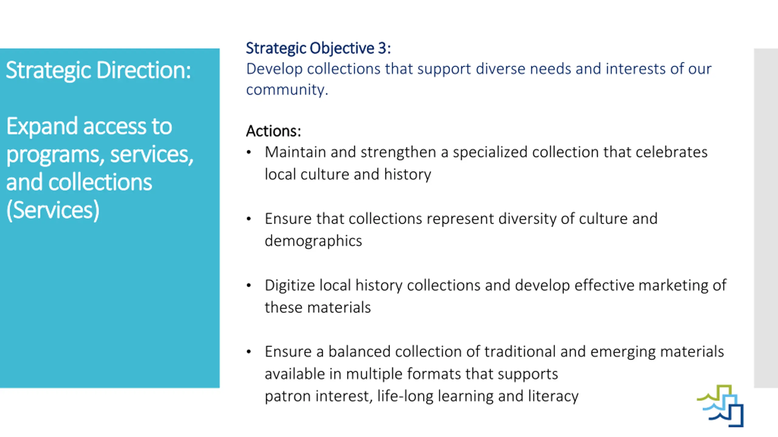 Strategic Objective 3: Strategic Objective 3: Develop collections that support diverse needs and interests of our community. Strategic Direction Strategic Direction: : Expand Expand access to access to programs, services, programs, services, and collections and collections (Services) (Services) Actions: Actions: Maintain and strengthen a specialized collection that celebrates local culture and history Ensure that collections represent diversity of culture and demographics Digitize local history collections and develop effective marketing of these materials Ensure a balanced collection of traditional and emerging materials available in multiple formats that supports patron interest, life-long learning and literacy
