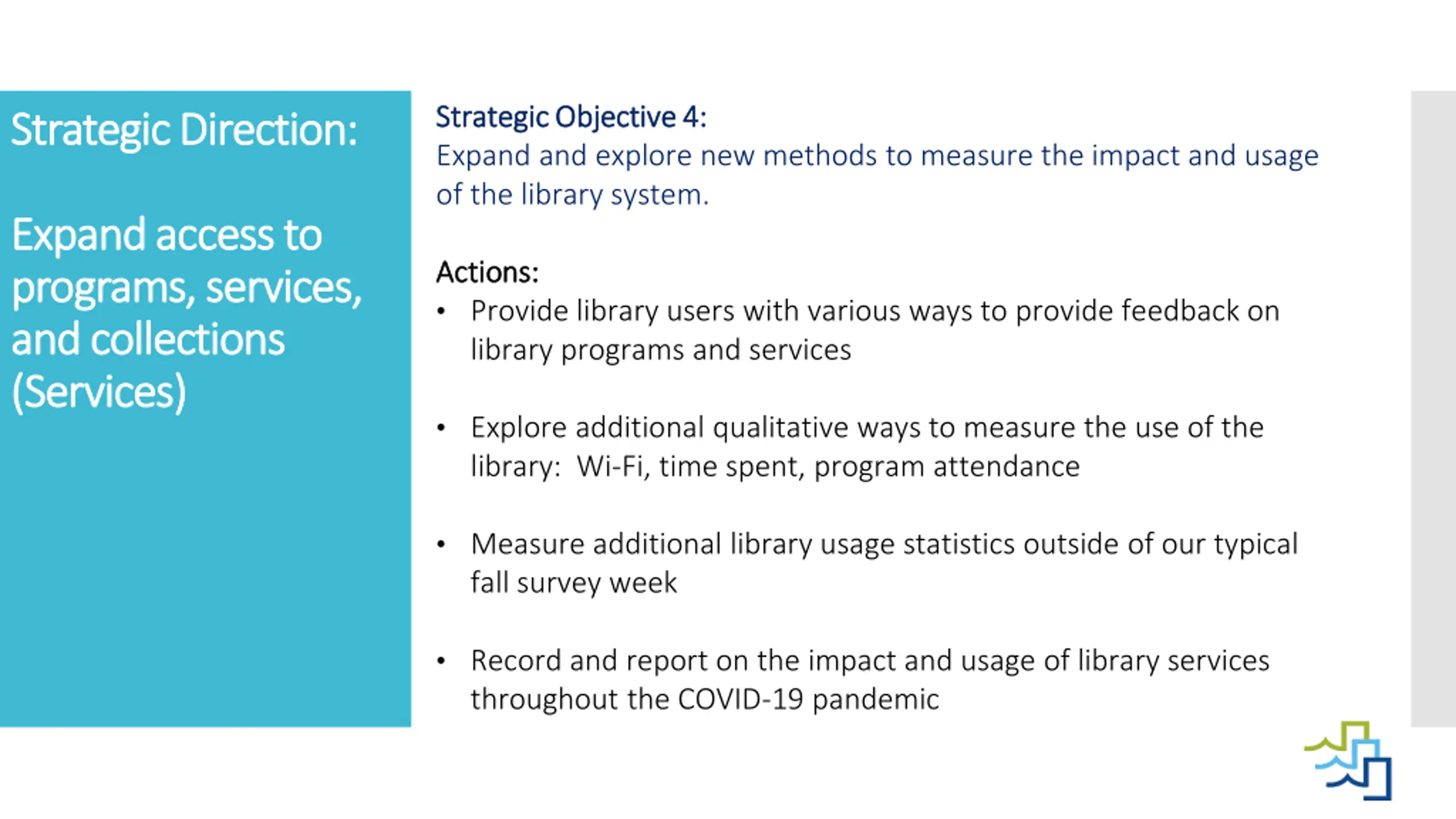 Strategic Objective 4: Strategic Objective 4: Expand and explore new methods to measure the impact and usage of the library system. Strategic Direction: Strategic Direction: Expand Expand access to access to programs, services, programs, services, and collections and collections (Services) (Services) Actions: Actions: Provide library users with various ways to provide feedback on library programs and services Explore additional qualitative ways to measure the use of the library: Wi-Fi, time spent, program attendance Measure additional library usage statistics outside of our typical fall survey week Record and report on the impact and usage of library services throughout the COVID-19 pandemic