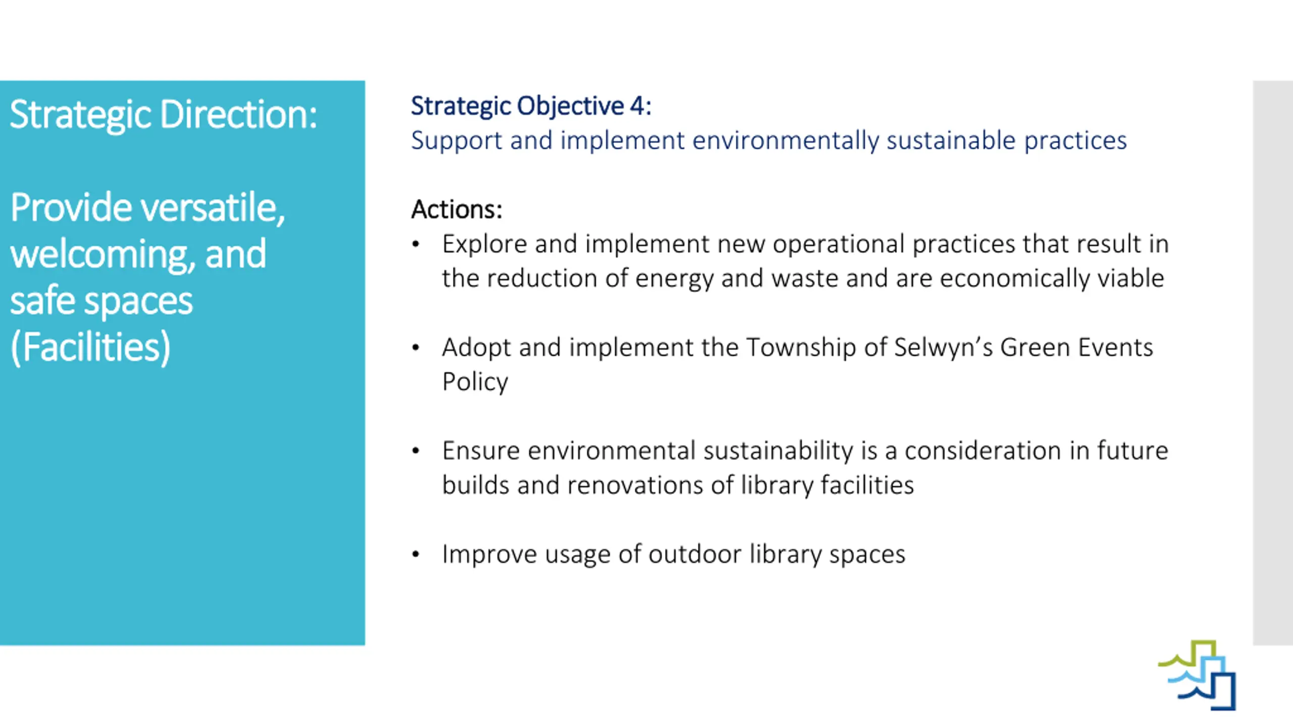 Strategic Objective 4: Strategic Objective 4: Support and implement environmentally sustainable practices Strategic Direction: Strategic Direction: Provide Provide versatile, versatile, welcoming, and welcoming, and safe spaces safe spaces (Facilities) (Facilities) Actions: Actions: Explore and implement new operational practices that result in the reduction of energy and waste and are economically viable Adopt and implement the Township of Selwyn s Green Events Policy Ensure environmental sustainability is a consideration in future builds and renovations of library facilities Improve usage of outdoor library spaces