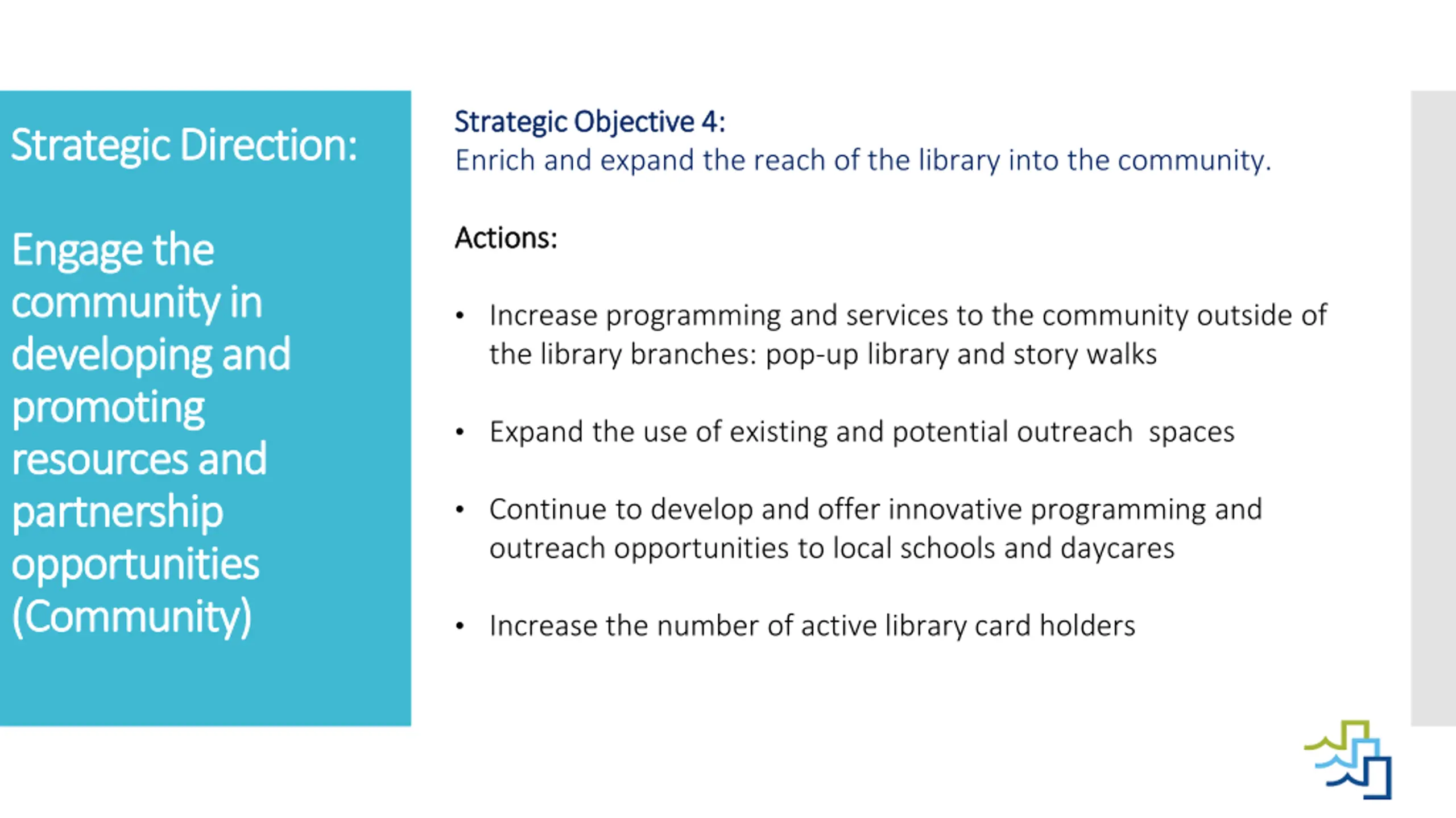 Strategic Objective 4: Strategic Objective 4: Enrich and expand the reach of the library into the community. Strategic Direction: Strategic Direction: Actions: Actions: Engage Engage the community in community in developing and developing and promoting promoting resources and resources and partnership partnership opportunities opportunities (Community) (Community) the Increase programming and services to the community outside of the library branches: pop-up library and story walks Expand the use of existing and potential outreach spaces Continue to develop and offer innovative programming and outreach opportunities to local schools and daycares Increase the number of active library card holders