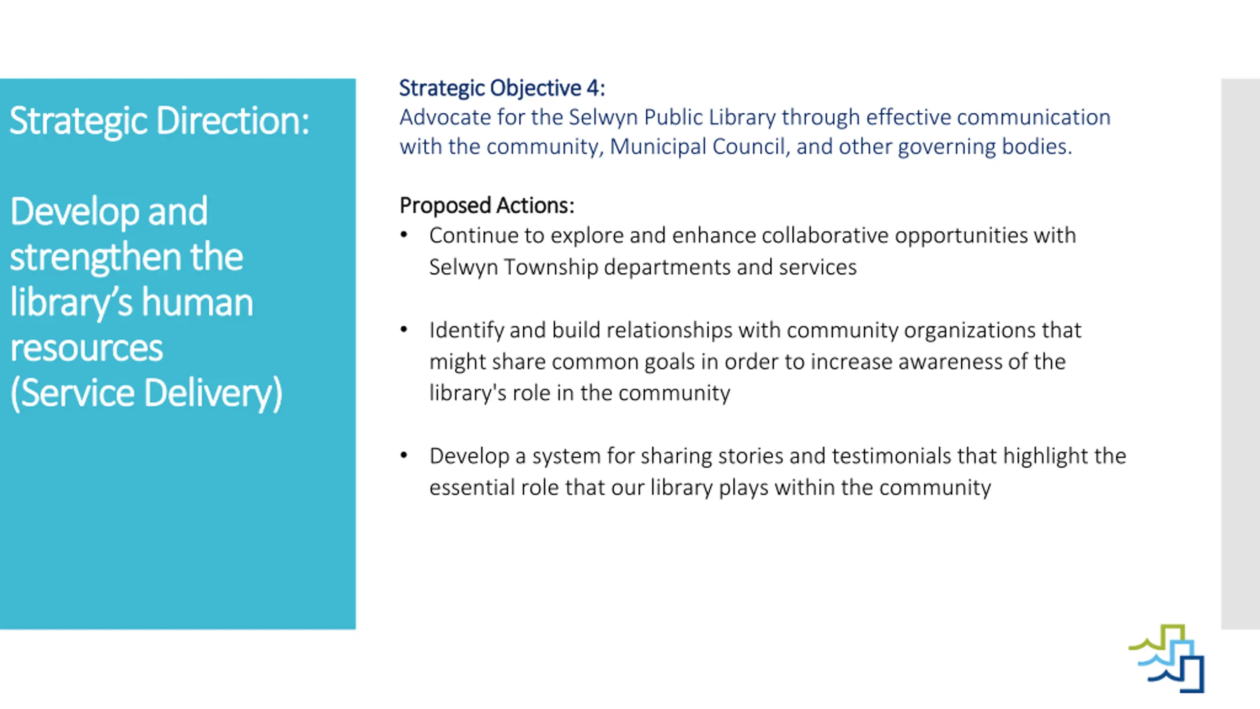 Strategic Objective 4: Strategic Objective 4: Advocate for the Selwyn Public Library through effective communication with the community, Municipal Council, and other governing bodies. Strategic Direction: Strategic Direction: Develop Develop and strengthen the strengthen the library s human library s human resources resources (Service Delivery) (Service Delivery) and Proposed Actions: Proposed Actions: Continue to explore and enhance collaborative opportunities with Selwyn Township departments and services Identify and build relationships with community organizations that might share common goals in order to increase awareness of the library's role in the community Develop a system for sharing stories and testimonials that highlight the essential role that our library plays within the community