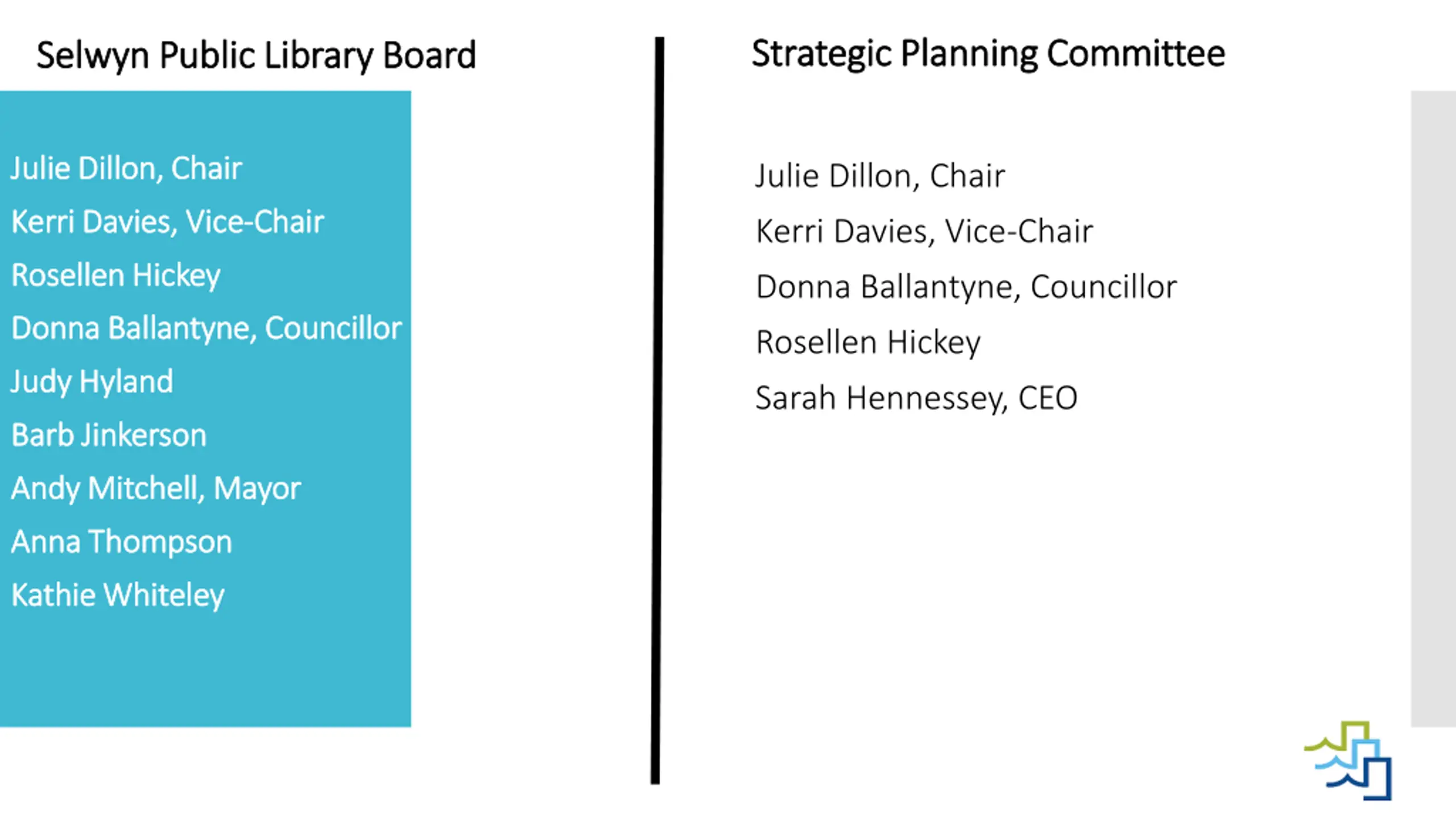 Strategic Planning Committee Strategic Planning Committee Selwyn Public Library Board Selwyn Public Library Board Julie Dillon, Chair Julie Dillon, Chair Julie Dillon, Chair Kerri Davies, Kerri Davies, Vice Vice- -Chair Chair Kerri Davies, Vice-Chair Rosellen RosellenHickey Hickey Donna Ballantyne, Councillor Donna Donna Ballantyne, Ballantyne, Councillor Councillor Rosellen Hickey Judy Hyland Judy Hyland Sarah Hennessey, CEO Barb Jinkerson Barb Jinkerson Andy Andy Mitchell, Mayor Mitchell, Mayor Anna Thompson Anna Thompson Kathie Kathie Whiteley Whiteley