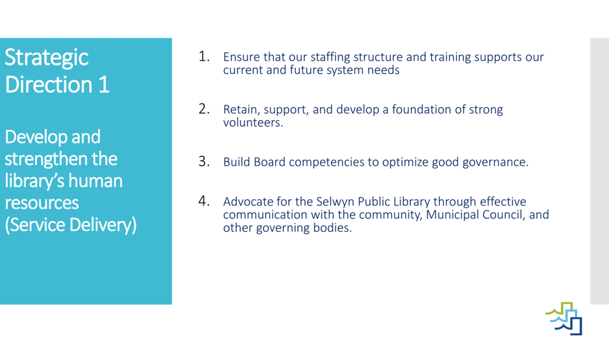 Strategic Strategic Direction Direction 1 1 1. Ensure that our staffing structure and training supports our current and future system needs 2. Retain, support, and develop a foundation of strong volunteers. Develop and Develop and strengthen the strengthen the library s human library s human resources resources (Service Delivery) (Service Delivery) 3. Build Board competencies to optimize good governance. 4. Advocate for the Selwyn Public Library through effective communication with the community, Municipal Council, and other governing bodies.