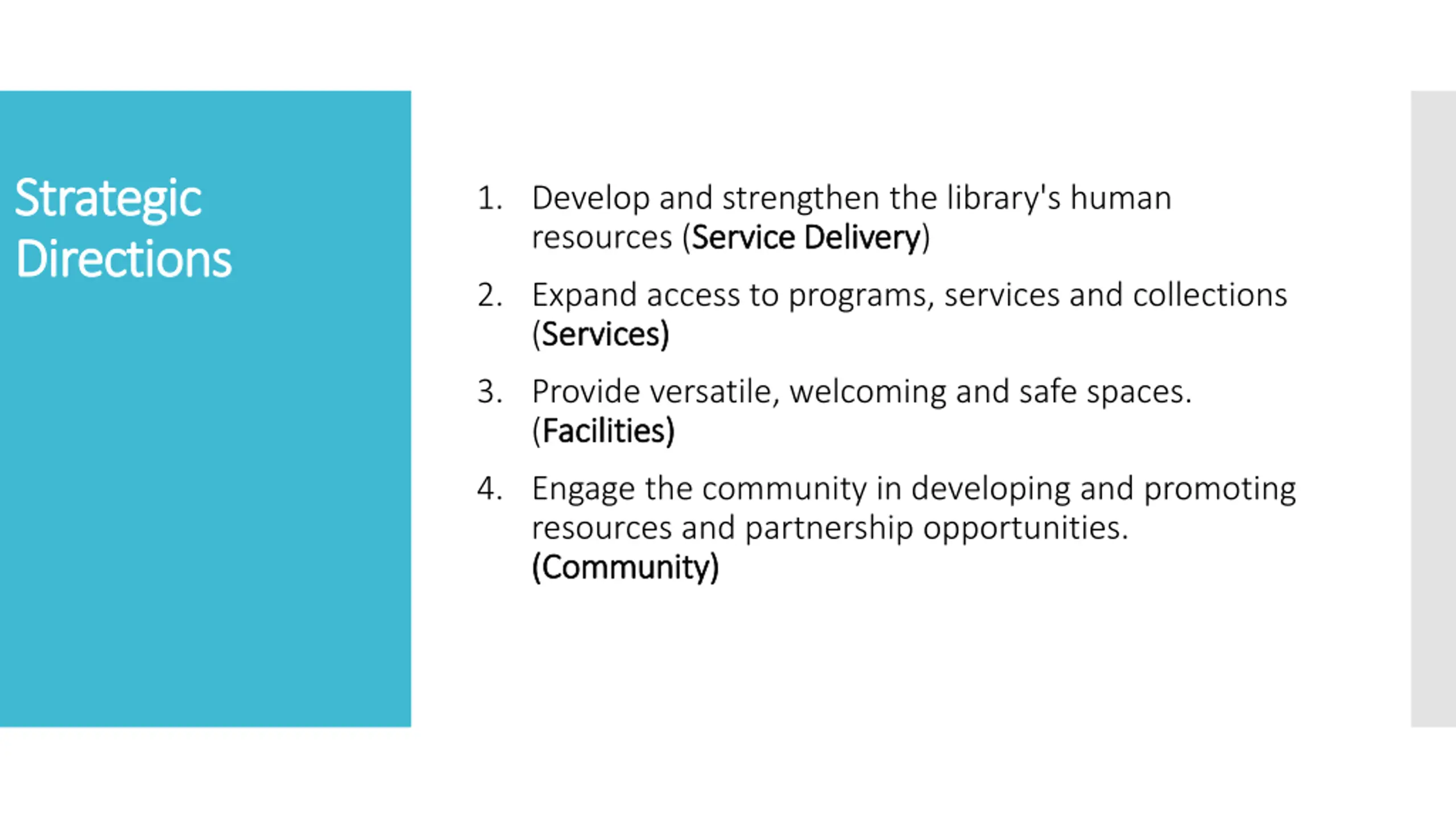 Strategic Strategic Directions Directions 1. Develop and strengthen the library's human resources (Service Service Delivery Delivery) 2. Expand access to programs, services and collections (Services) Services) 3. Provide versatile, welcoming and safe spaces. (Facilities) Facilities) 4. Engage the community in developing and promoting resources and partnership opportunities. (Community) (Community)