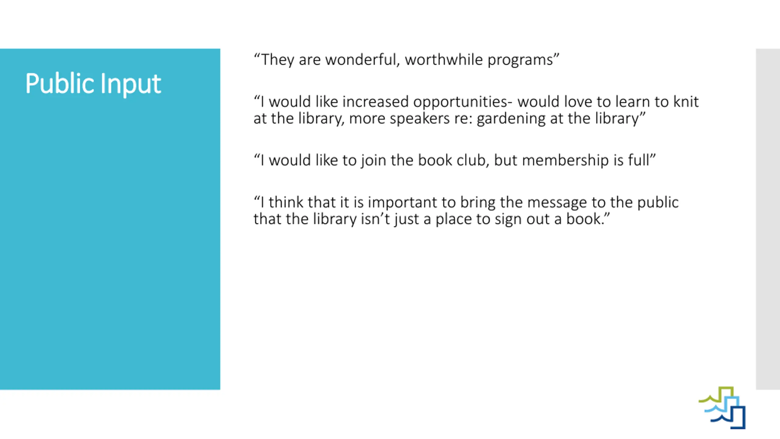 They are wonderful, worthwhile programs Public Input Public Input I would like increased opportunities- would love to learn to knit at the library, more speakers re: gardening at the library I would like to join the book club, but membership is full I think that it is important to bring the message to the public that the library isn t just a place to sign out a book.