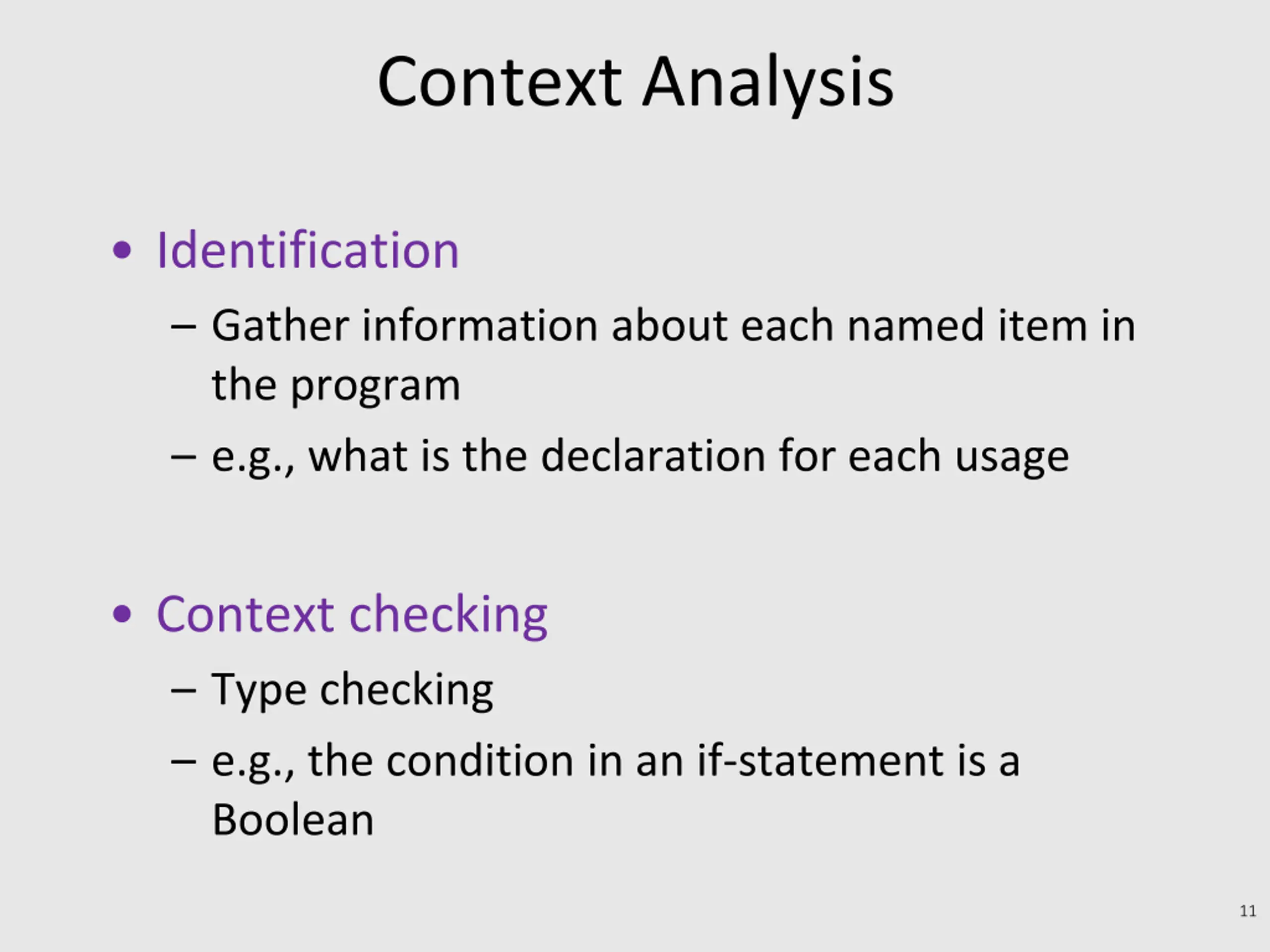 Context Analysis Identification Gather information about each named item in the program e.g., what is the declaration for each usage Context checking Type checking e.g., the condition in an if-statement is a Boolean 11
