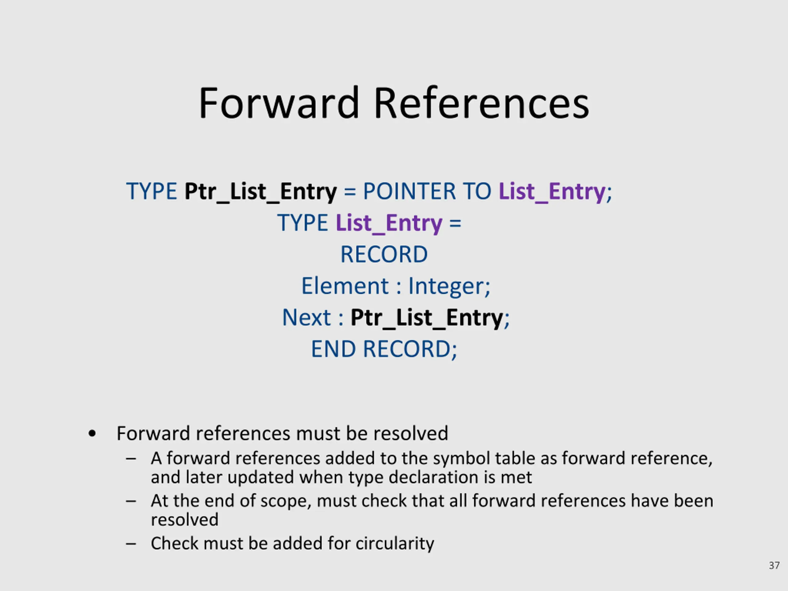 Forward References TYPE Ptr_List_Entry = POINTER TO List_Entry; TYPE List_Entry = RECORD Element : Integer; Next : Ptr_List_Entry; END RECORD; Forward references must be resolved A forward references added to the symbol table as forward reference, and later updated when type declaration is met At the end of scope, must check that all forward references have been resolved Check must be added for circularity 37