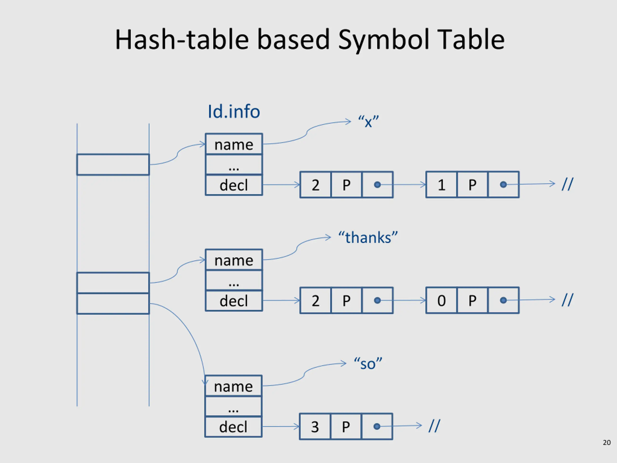 Hash-table based Symbol Table Id.info x name decl // 1 P 2 P thanks name decl // 0 P 2 P so name decl // 3 P 20