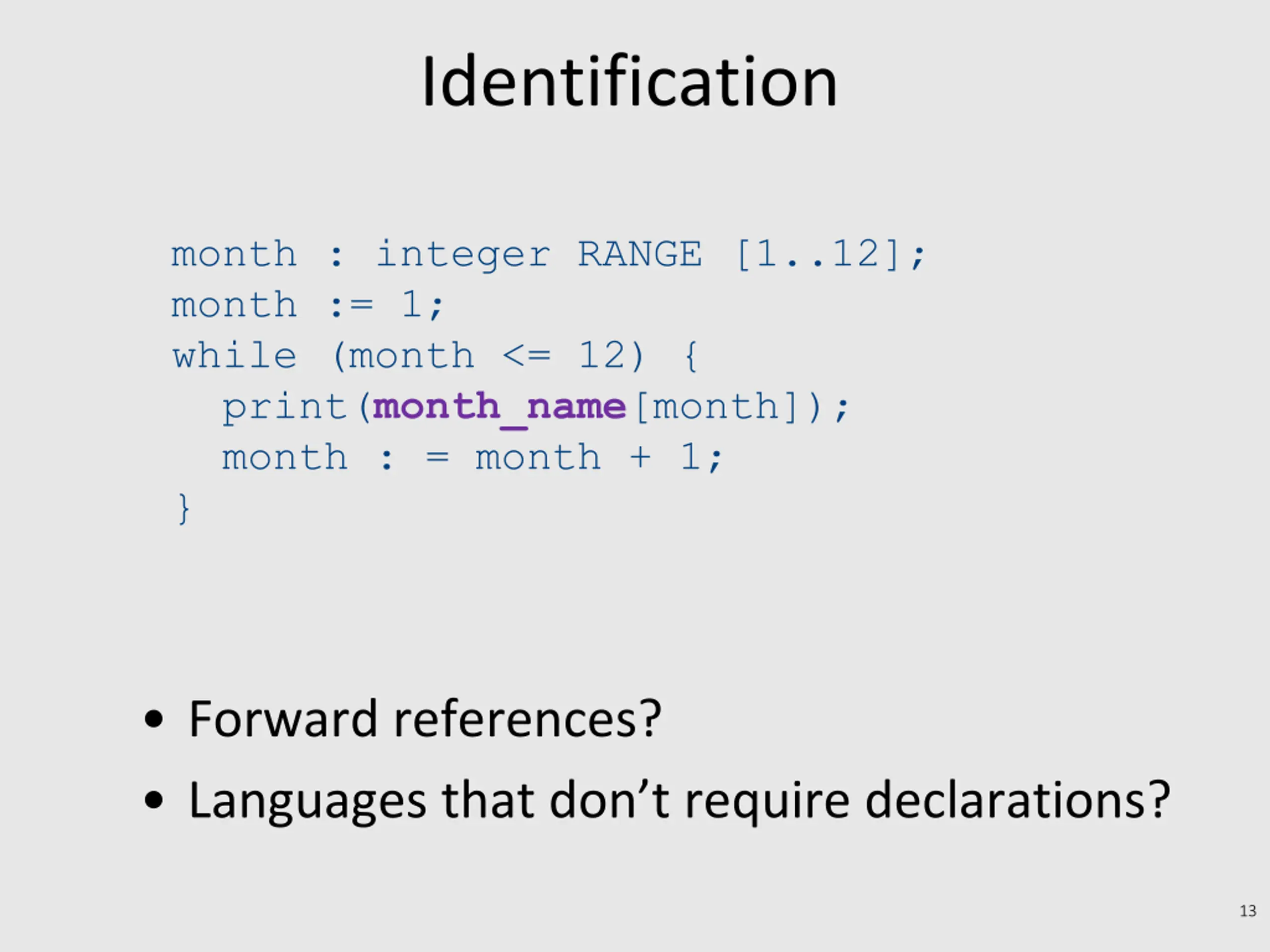 Identification month : integer RANGE [1..12]; month := 1; while (month <= 12) { print(month_name[month]); month : = month + 1; } Forward references? Languages that don t require declarations? 13