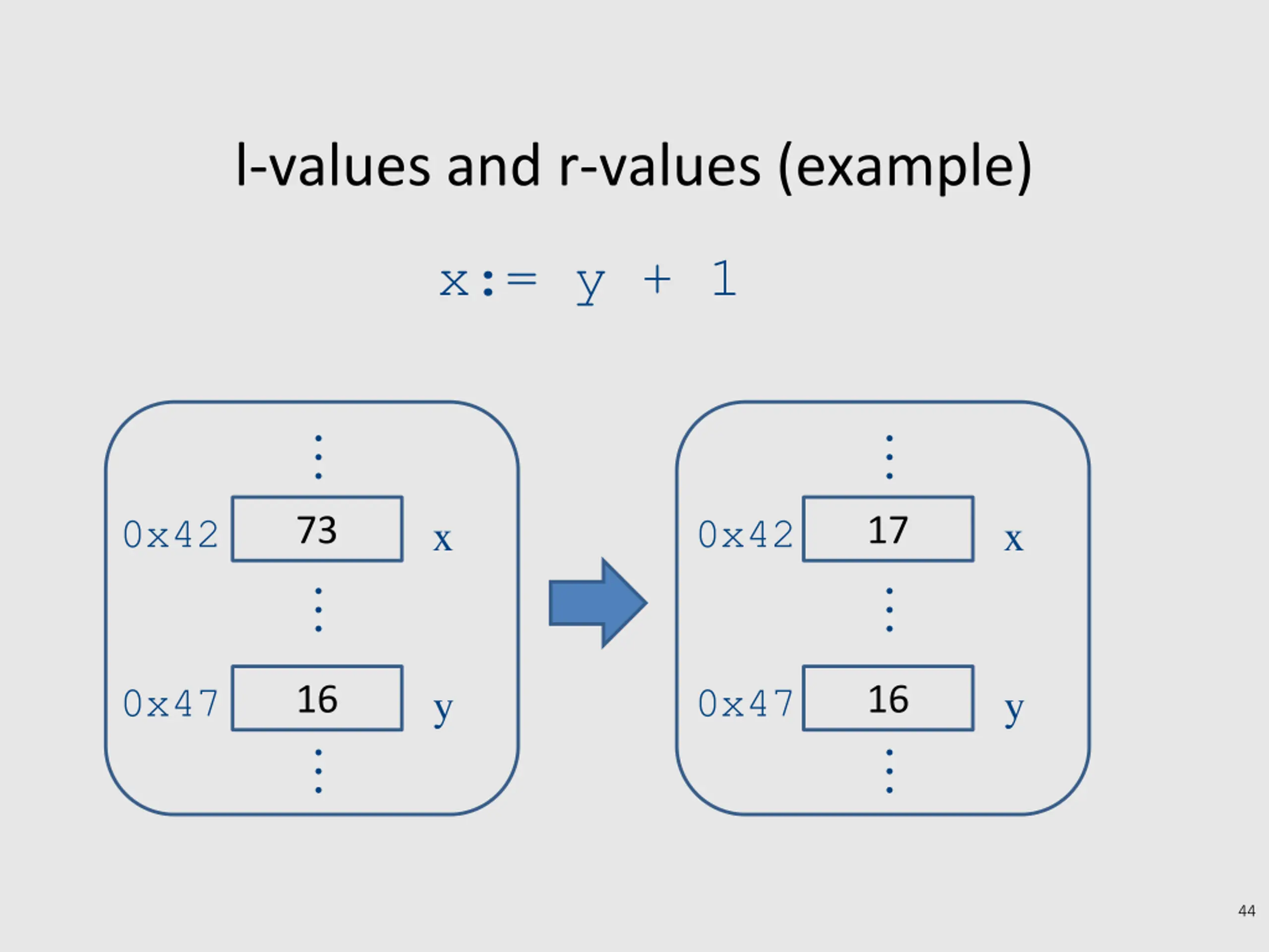 l-values and r-values (example) x:= y + 1 73 17 0x42 0x42 x x 16 16 0x47 0x47 y y 44
