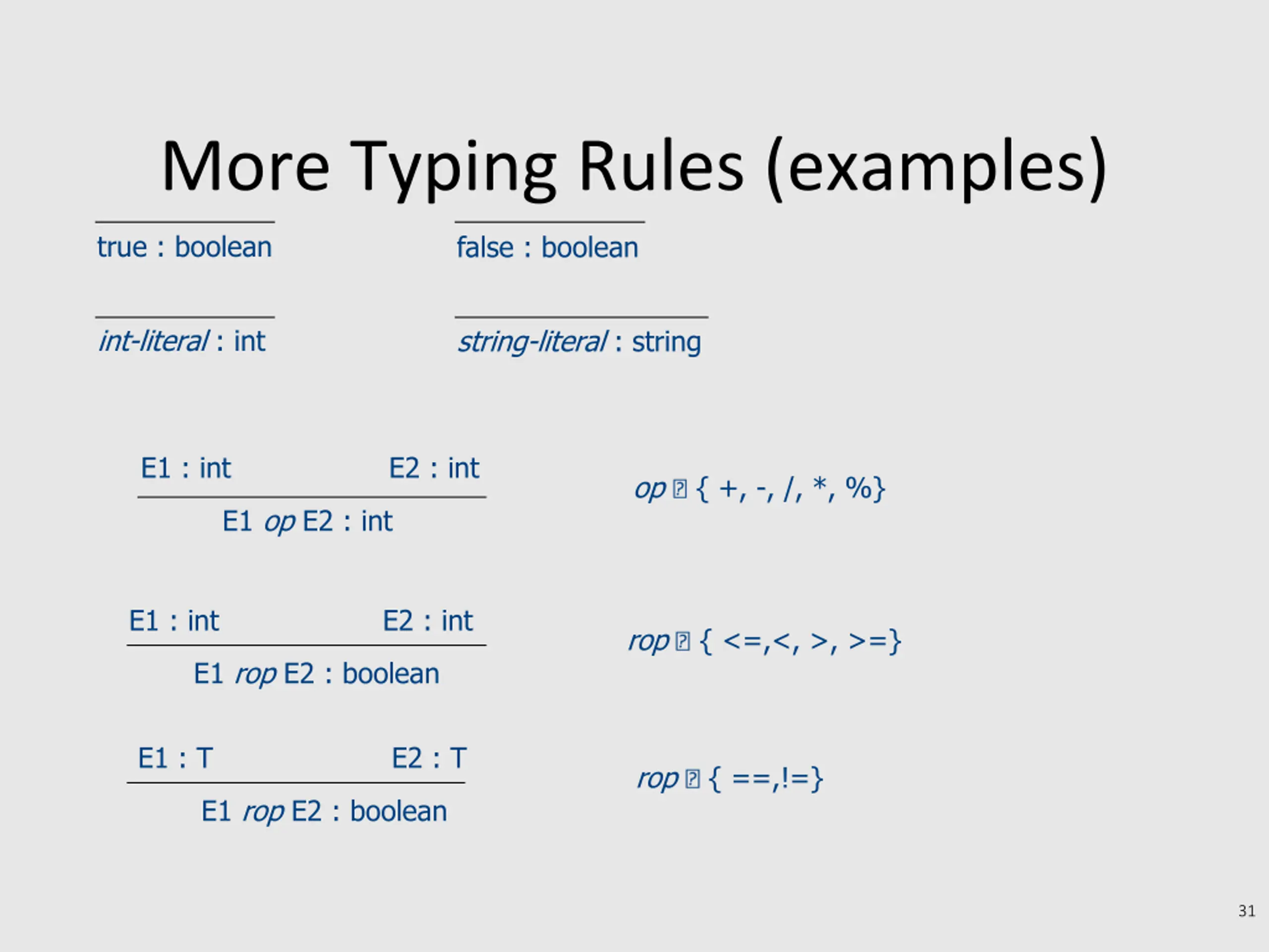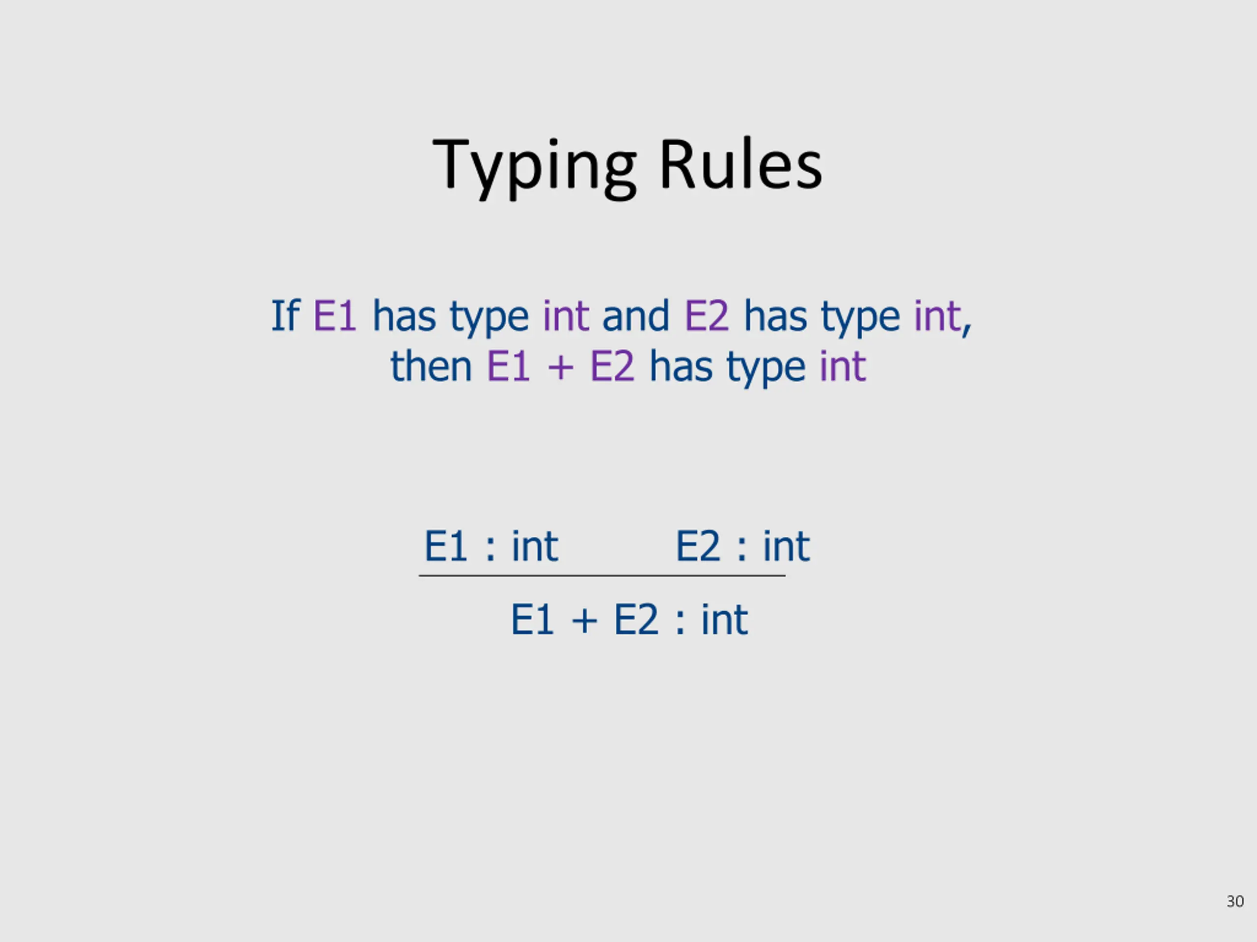 Typing Rules If E1 has type int and E2 has type int, then E1 + E2 has type int E1 : int E2 : int E1 + E2 : int 30