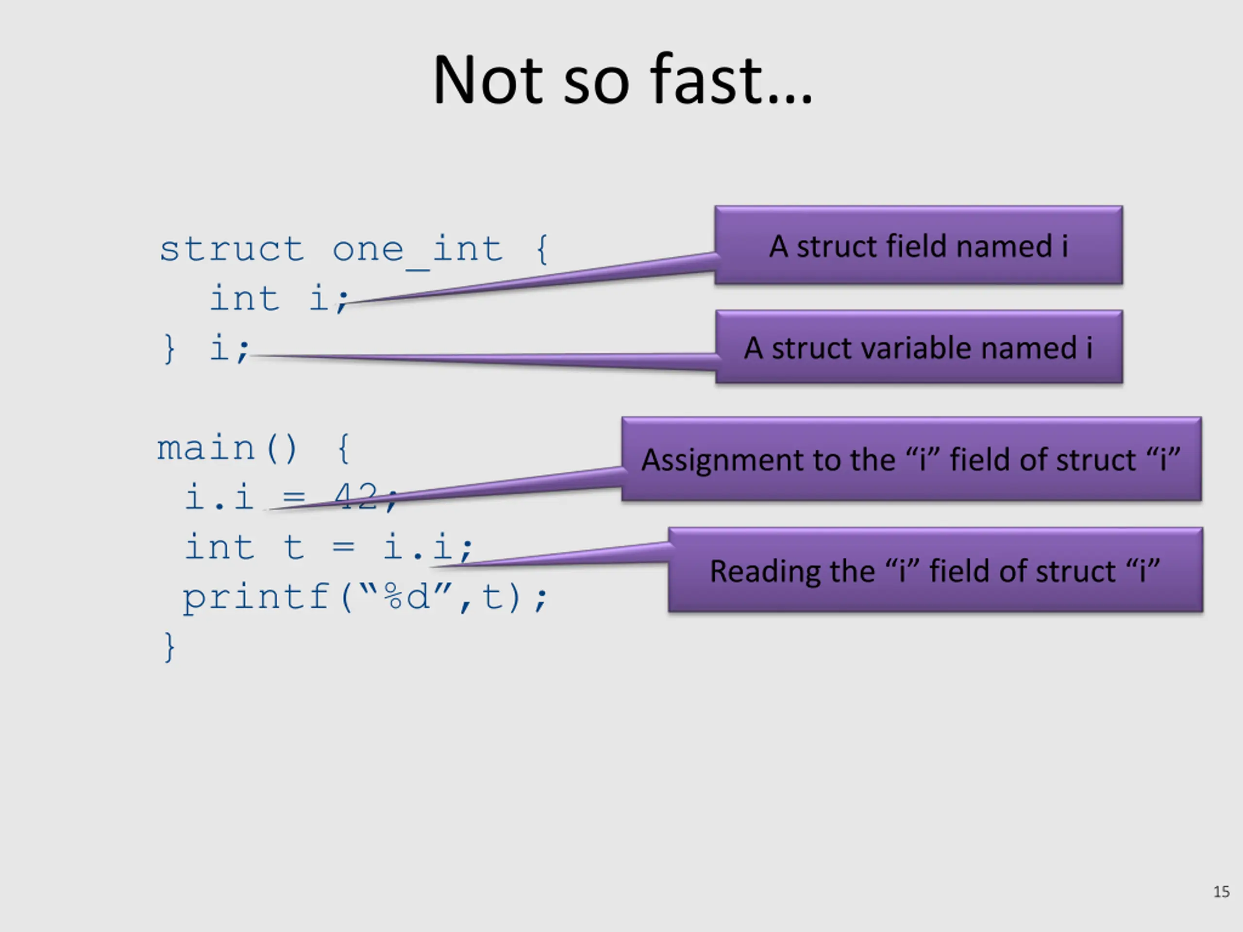 Not so fast struct one_int { int i; } i; A struct field named i A struct variable named i main() { i.i = 42; int t = i.i; printf( %d ,t); } Assignment to the i field of struct i Reading the i field of struct i 15