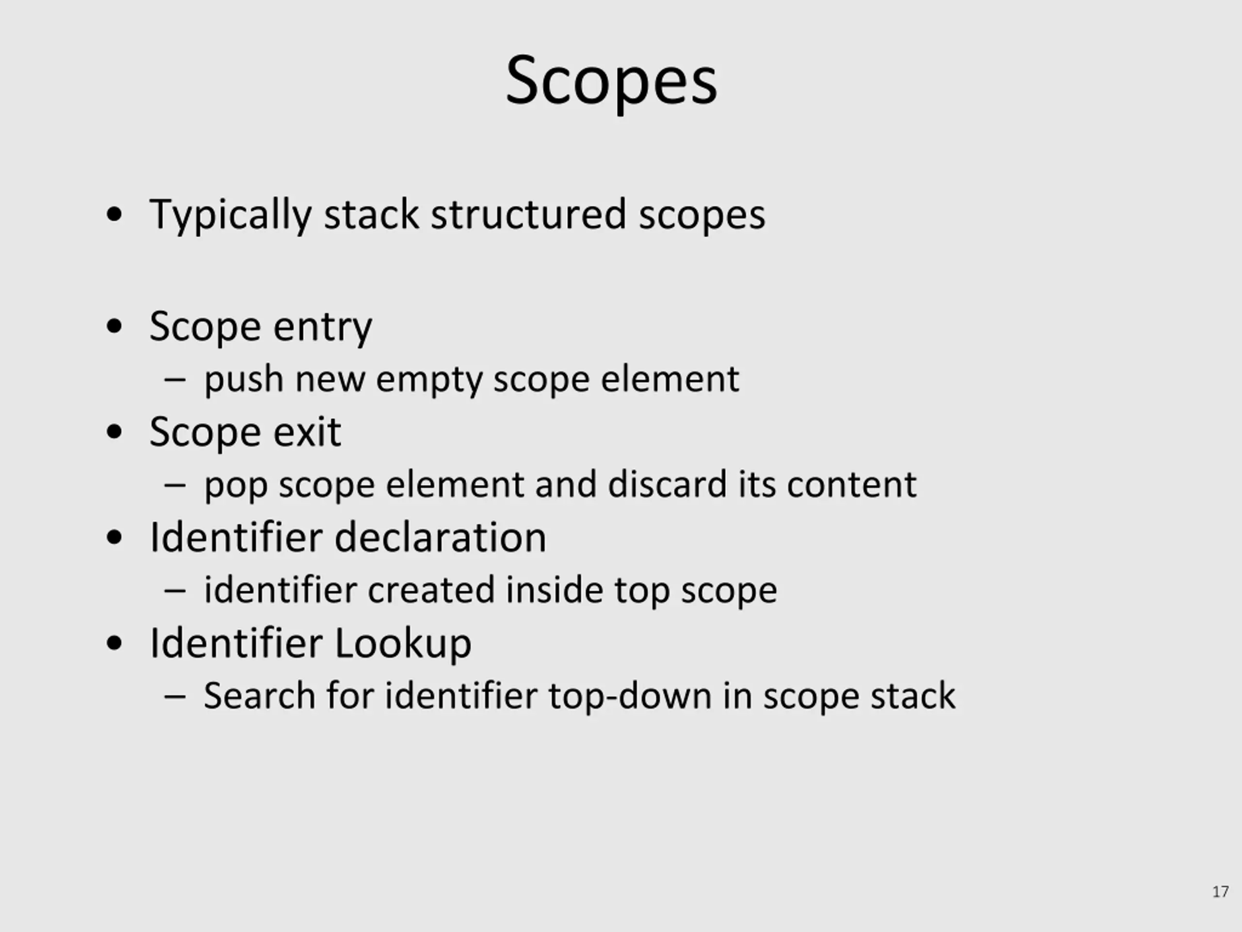 Scopes Typically stack structured scopes Scope entry push new empty scope element Scope exit pop scope element and discard its content Identifier declaration identifier created inside top scope Identifier Lookup Search for identifier top-down in scope stack 17