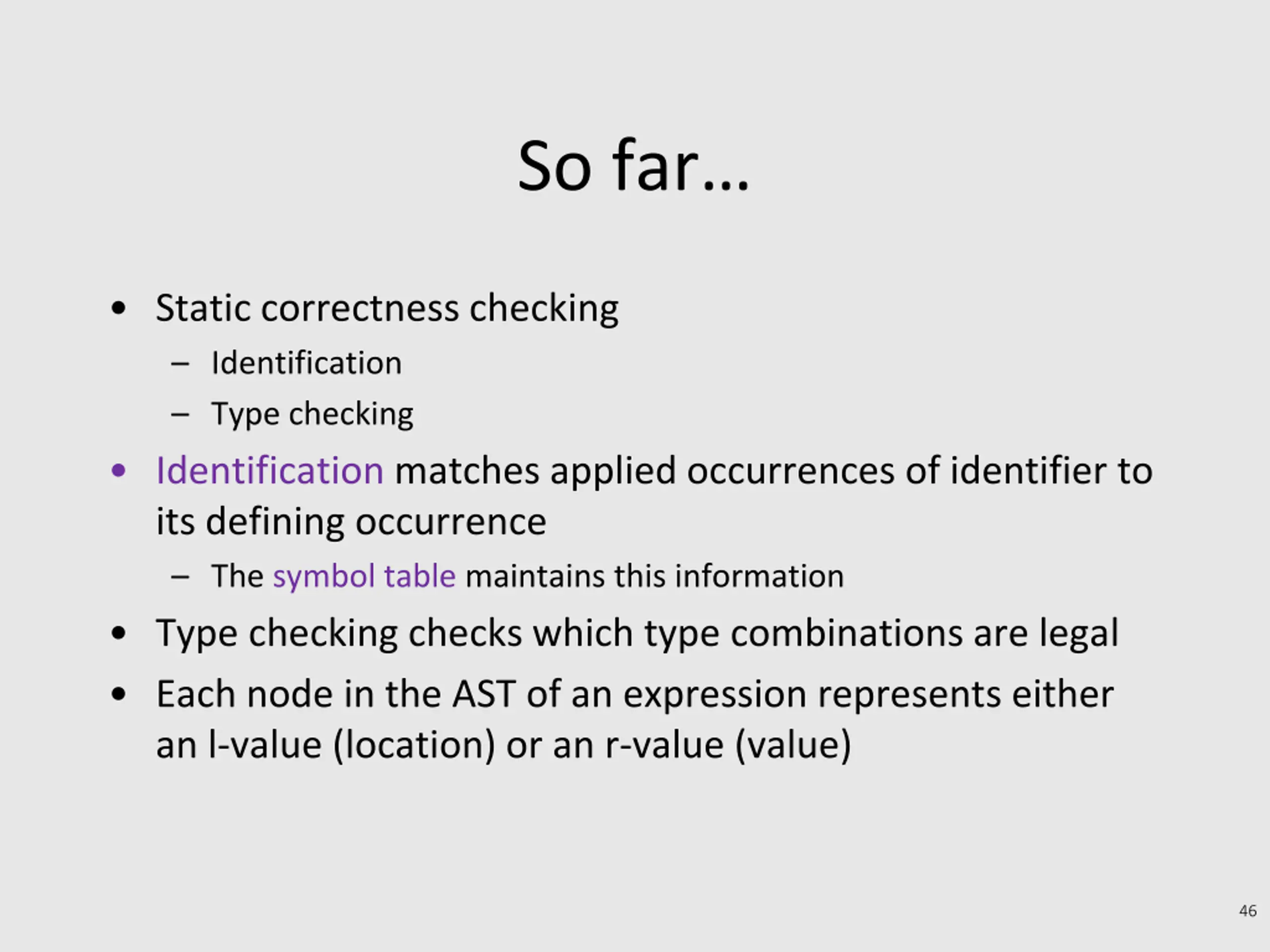 So far Static correctness checking Identification Type checking Identification matches applied occurrences of identifier to its defining occurrence The symbol table maintains this information Type checking checks which type combinations are legal Each node in the AST of an expression represents either an l-value (location) or an r-value (value) 46