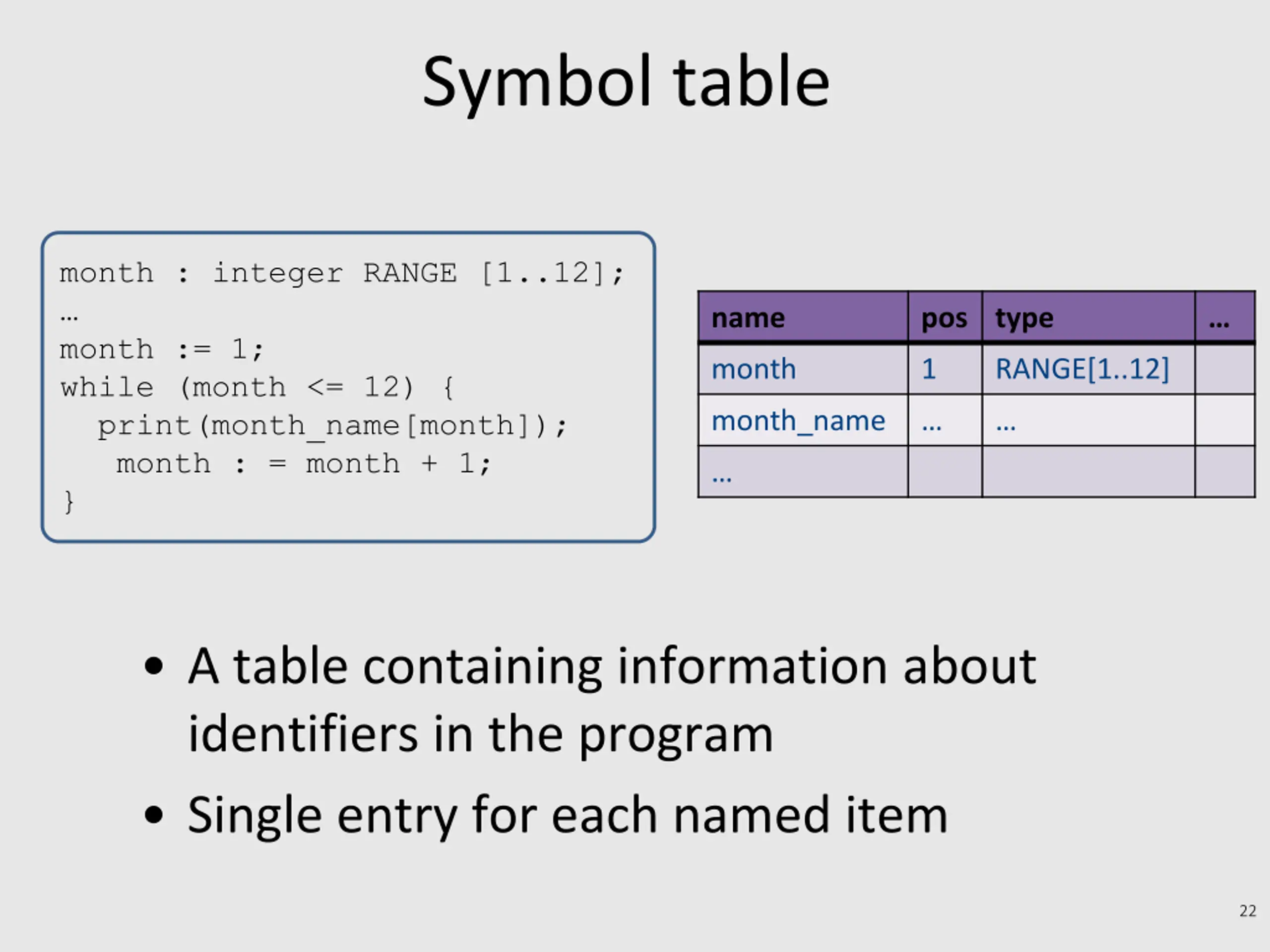 Symbol table month : integer RANGE [1..12]; month := 1; while (month <= 12) { print(month_name[month]); month : = month + 1; } name pos type month 1 RANGE[1..12] month_name A table containing information about identifiers in the program Single entry for each named item 22