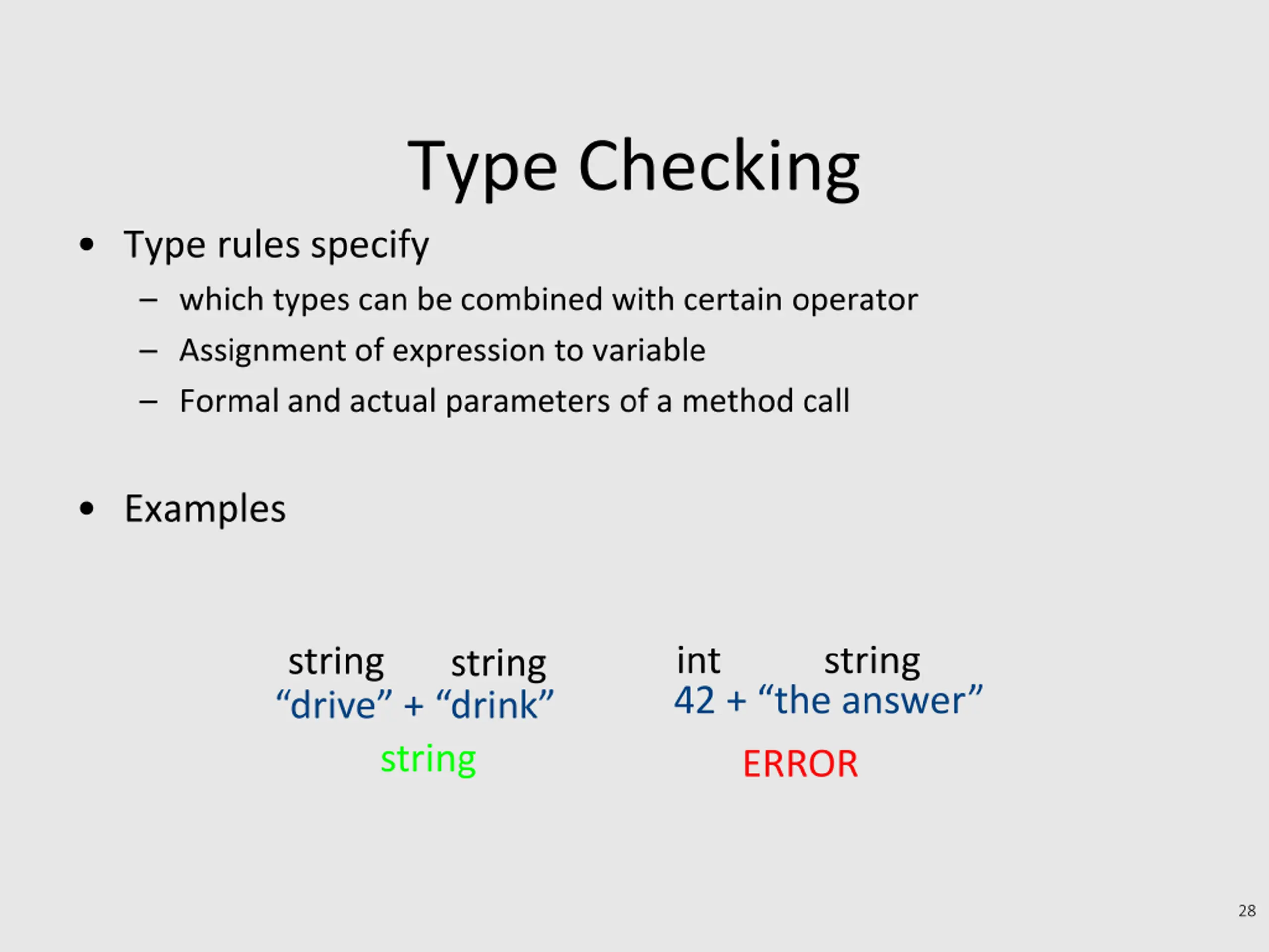Type Checking Type rules specify which types can be combined with certain operator Assignment of expression to variable Formal and actual parameters of a method call Examples int string string string 42 + the answer drive + drink string ERROR 28