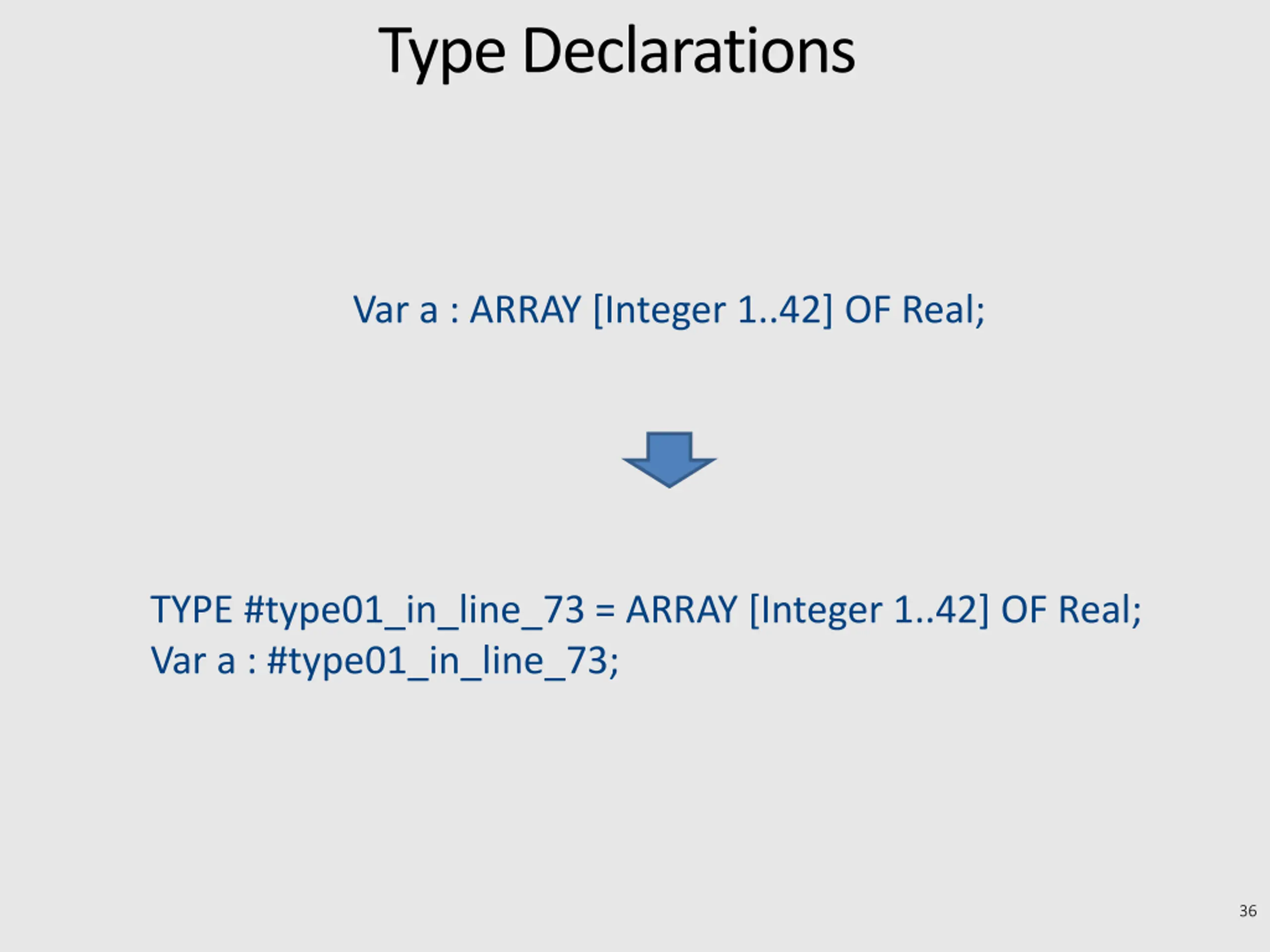 Type Declarations Var a : ARRAY [Integer 1..42] OF Real; TYPE #type01_in_line_73 = ARRAY [Integer 1..42] OF Real; Var a : #type01_in_line_73; 36