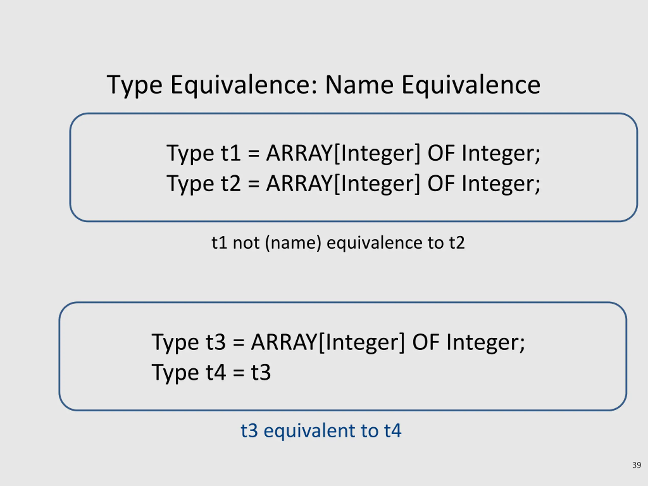 Type Equivalence: Name Equivalence Type t1 = ARRAY[Integer] OF Integer; Type t2 = ARRAY[Integer] OF Integer; t1 not (name) equivalence to t2 Type t3 = ARRAY[Integer] OF Integer; Type t4 = t3 t3 equivalent to t4 39