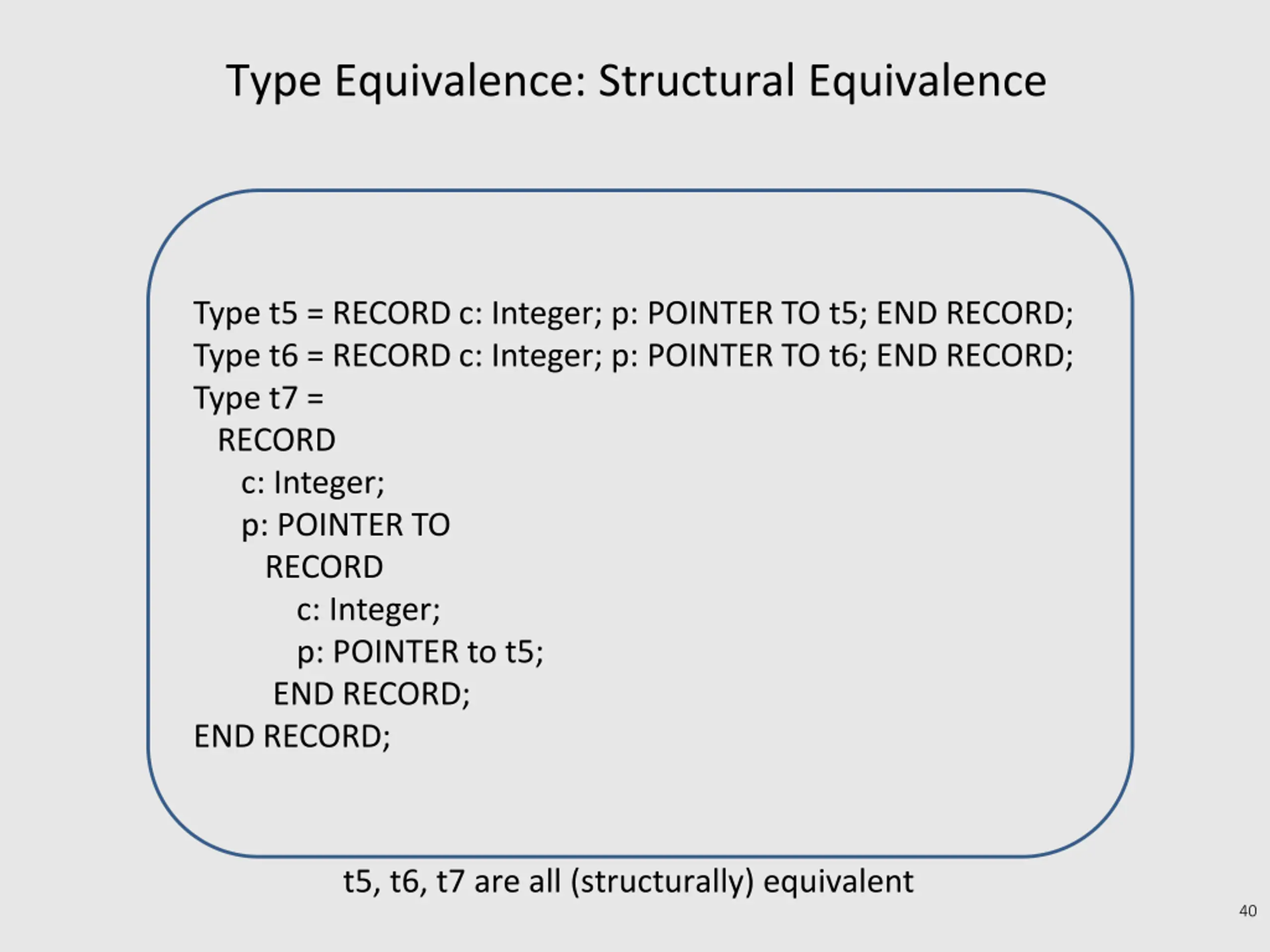 Type Equivalence: Structural Equivalence Type t5 = RECORD c: Integer; p: POINTER TO t5; END RECORD; Type t6 = RECORD c: Integer; p: POINTER TO t6; END RECORD; Type t7 = RECORD c: Integer; p: POINTER TO RECORD c: Integer; p: POINTER to t5; END RECORD; END RECORD; t5, t6, t7 are all (structurally) equivalent 40