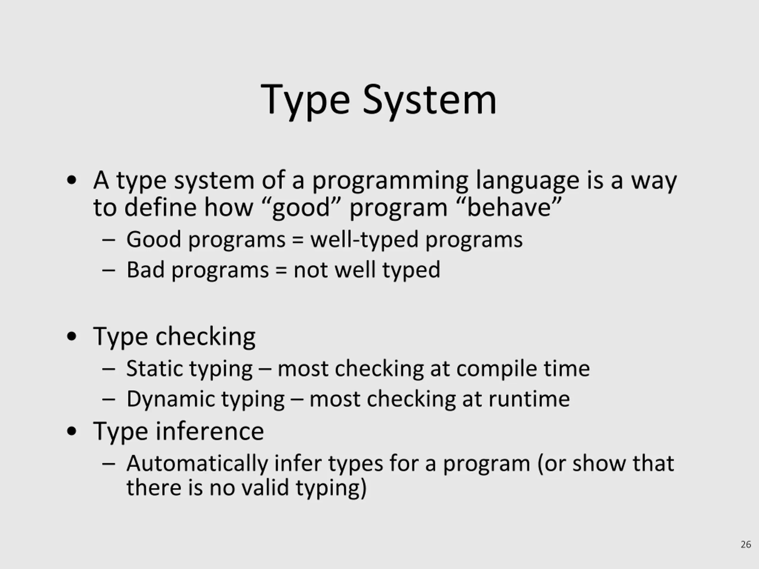 Type System (textbook definition) A type system is a tractable syntactic method for proving the absence of certain program behaviors by classifying phrases according to the kinds of values they compute -- Types and Programming Languages by Benjamin C. Pierce 25